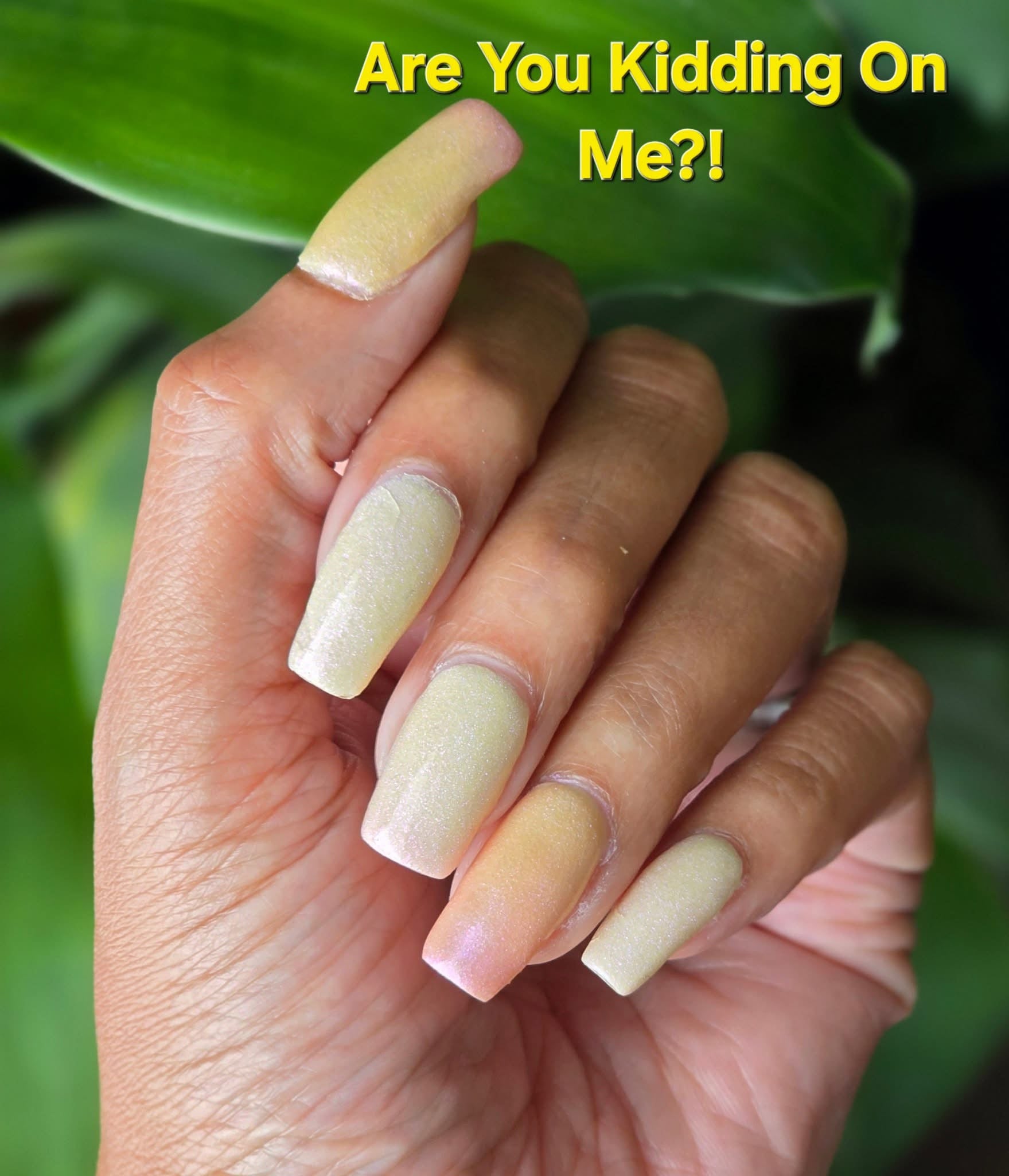 Are You Kidding On Me?! Nail Dip Powder is a chrome pink when cold and shifts to a soft yellow when warm and can turn to a light green when very very hot.