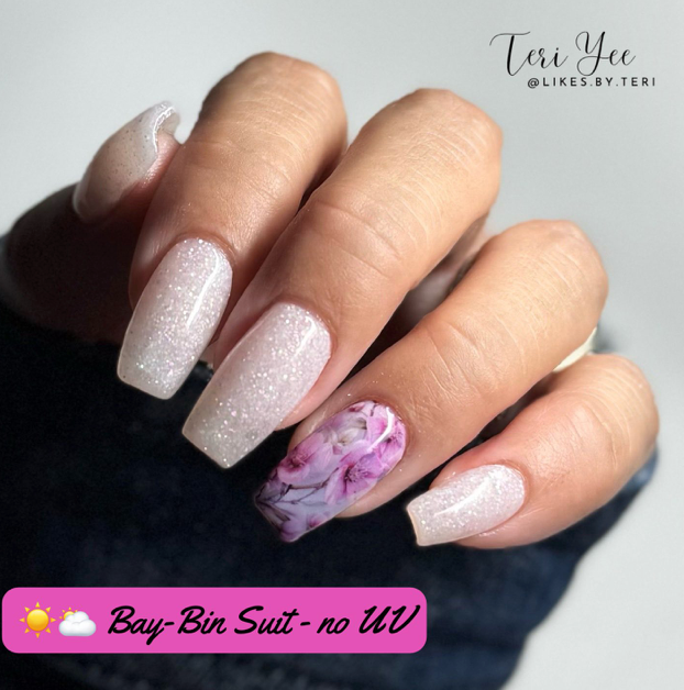 Bay-Bin Suit is a UV Dip powder. It will be a shimmery flaky whitish color inside and will switch to a pink outside in the sun or a berry color in a UV light.