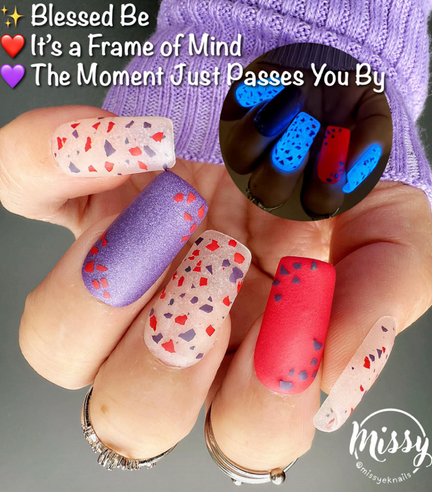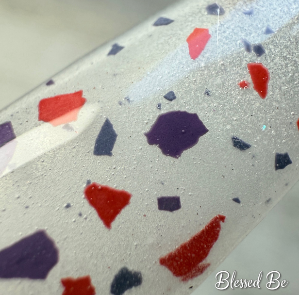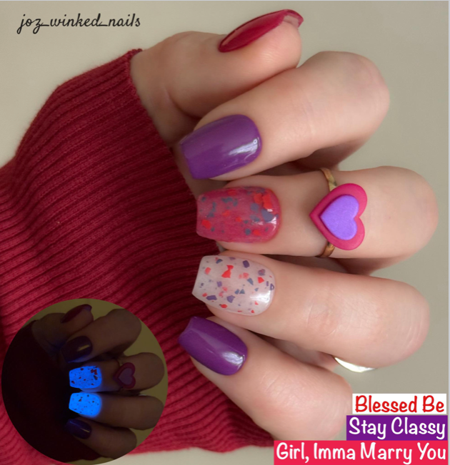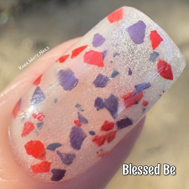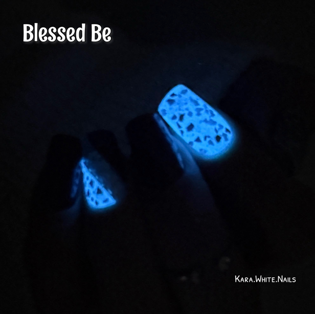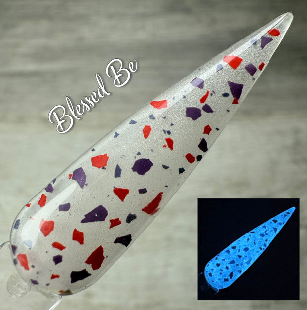 Blessed Be has a milky base that glows in the dark with deep purple, deep bluish purple, and red man glitter shards.