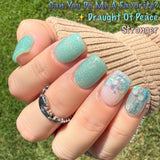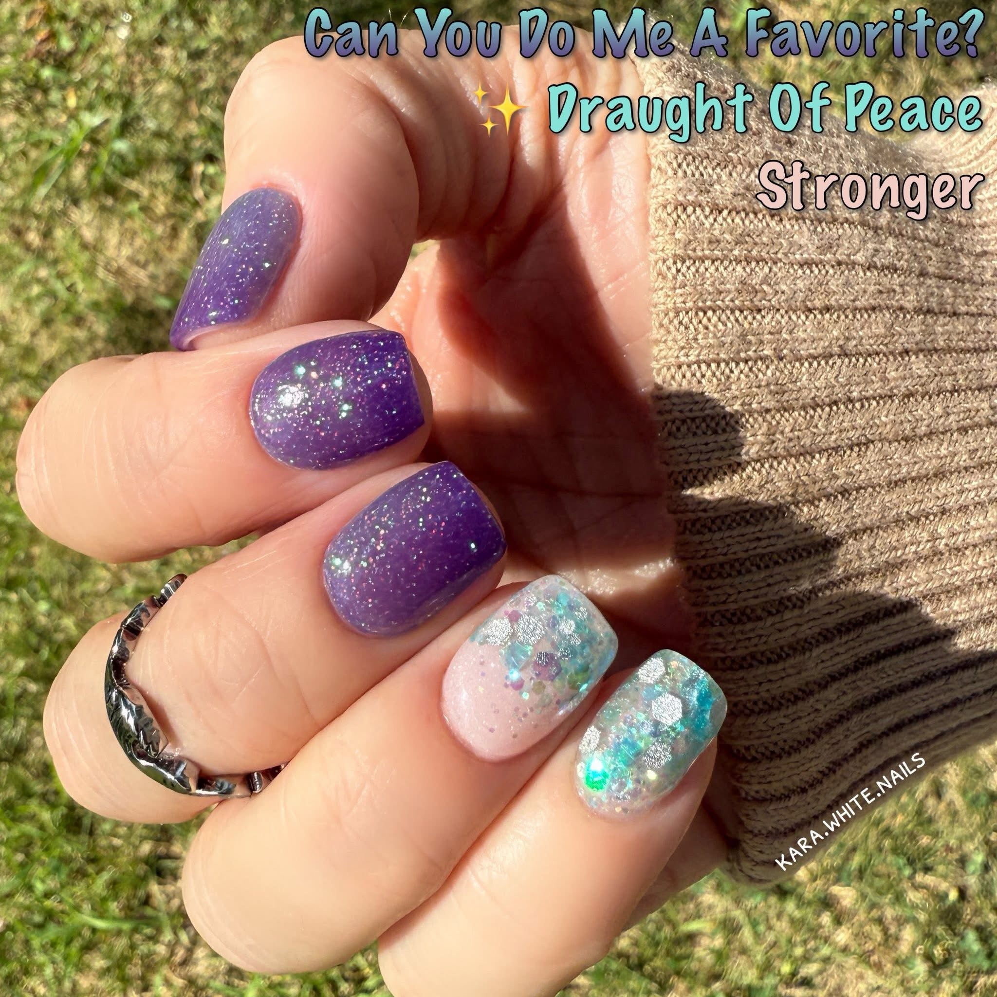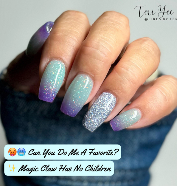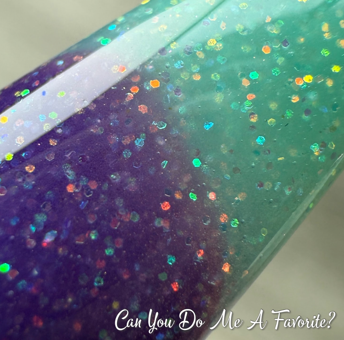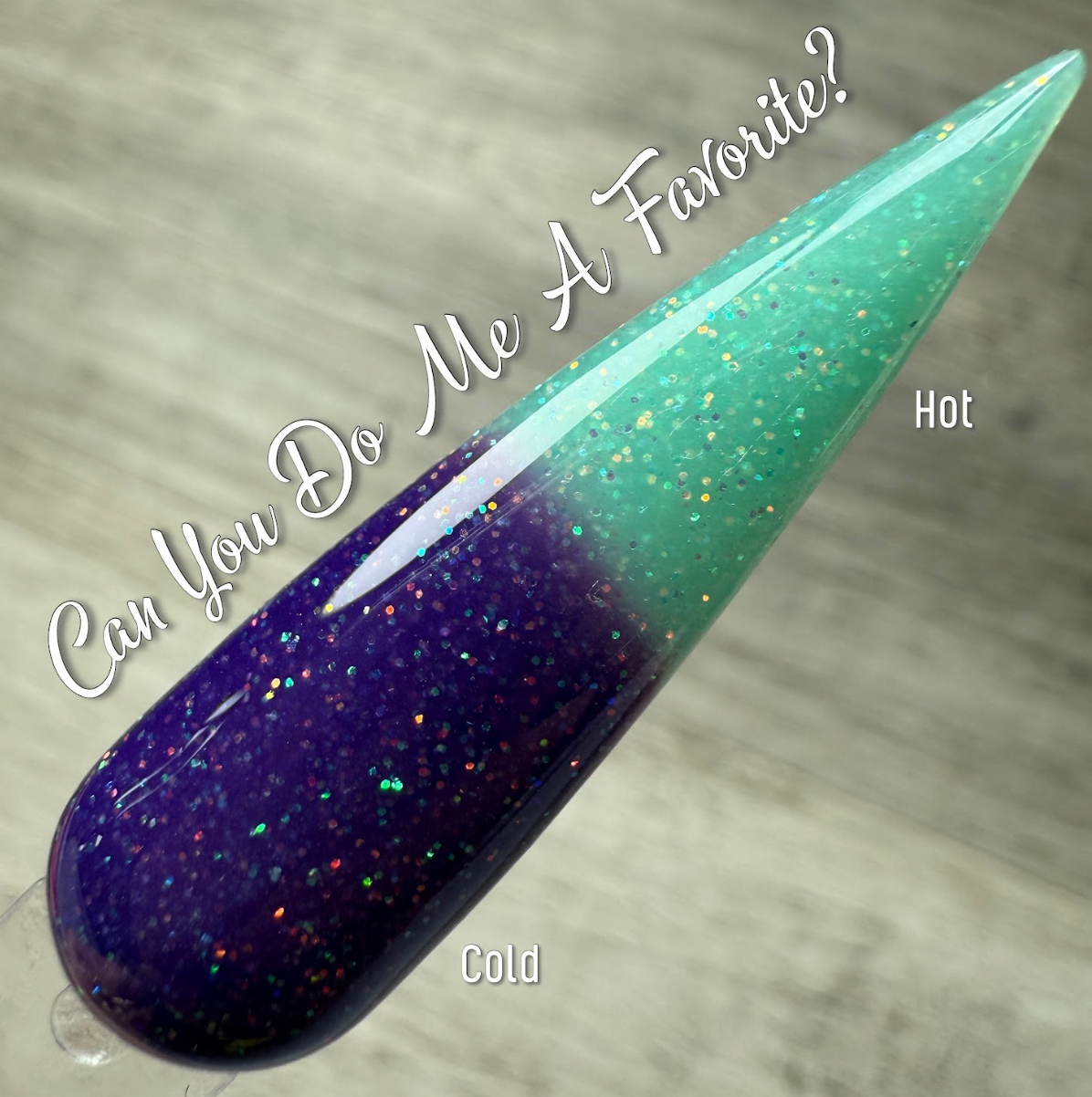 Can You Do Me A Favorite? Nail Dip Powder is a thermal dip powder. It is a deep purple navy when cold and changes to a soft blueish turquoise with fine glitter when hot.