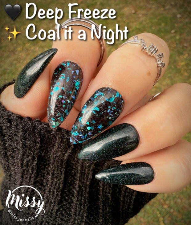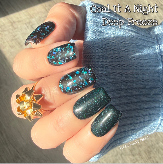 Coal It A Night has a black base with various shades of blue and teal glitter shards