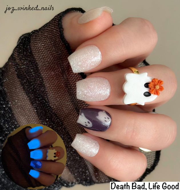 Death Bad, Life Good white sheer solid that has big shimmerthroughout. Glows in the dark