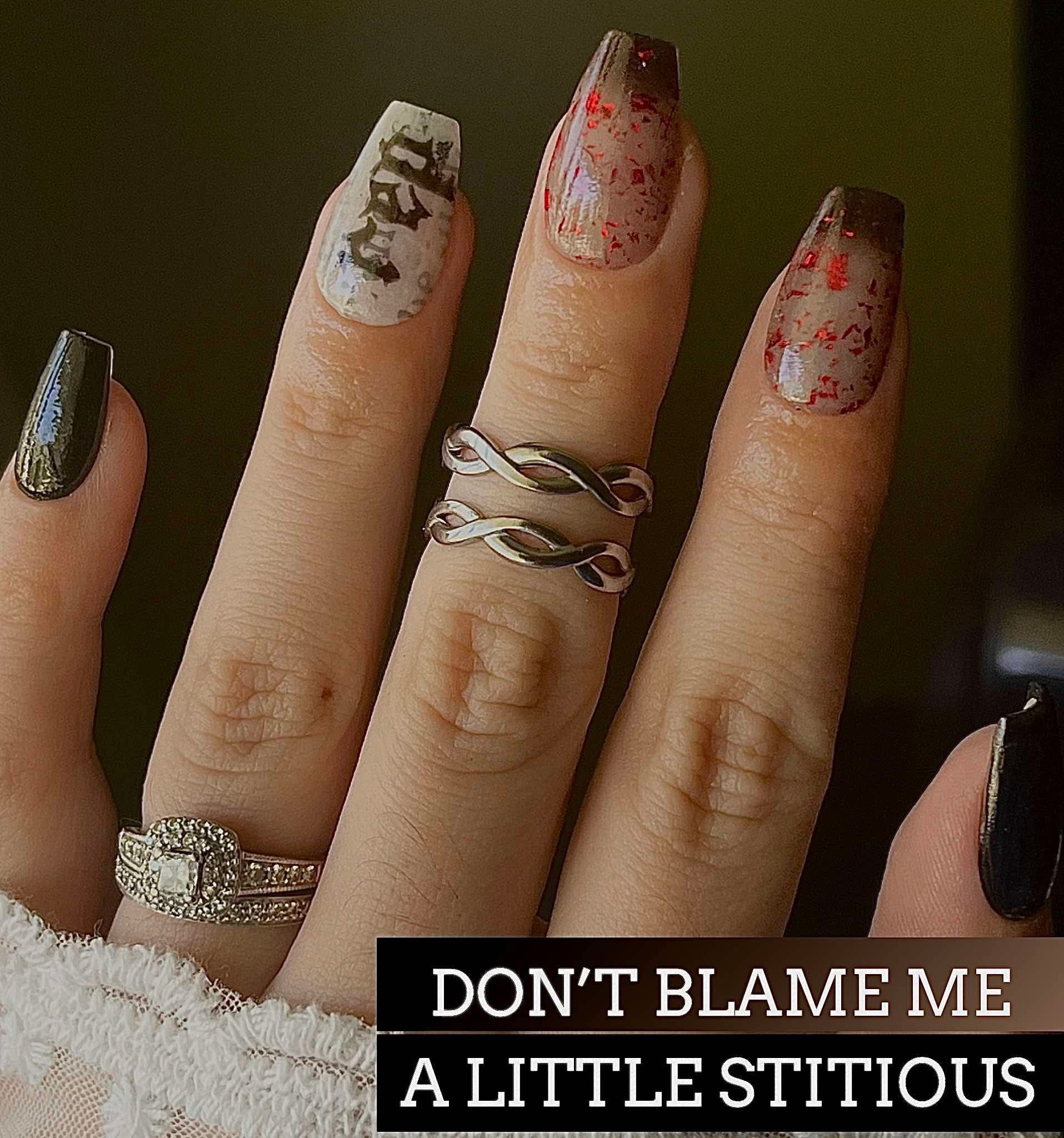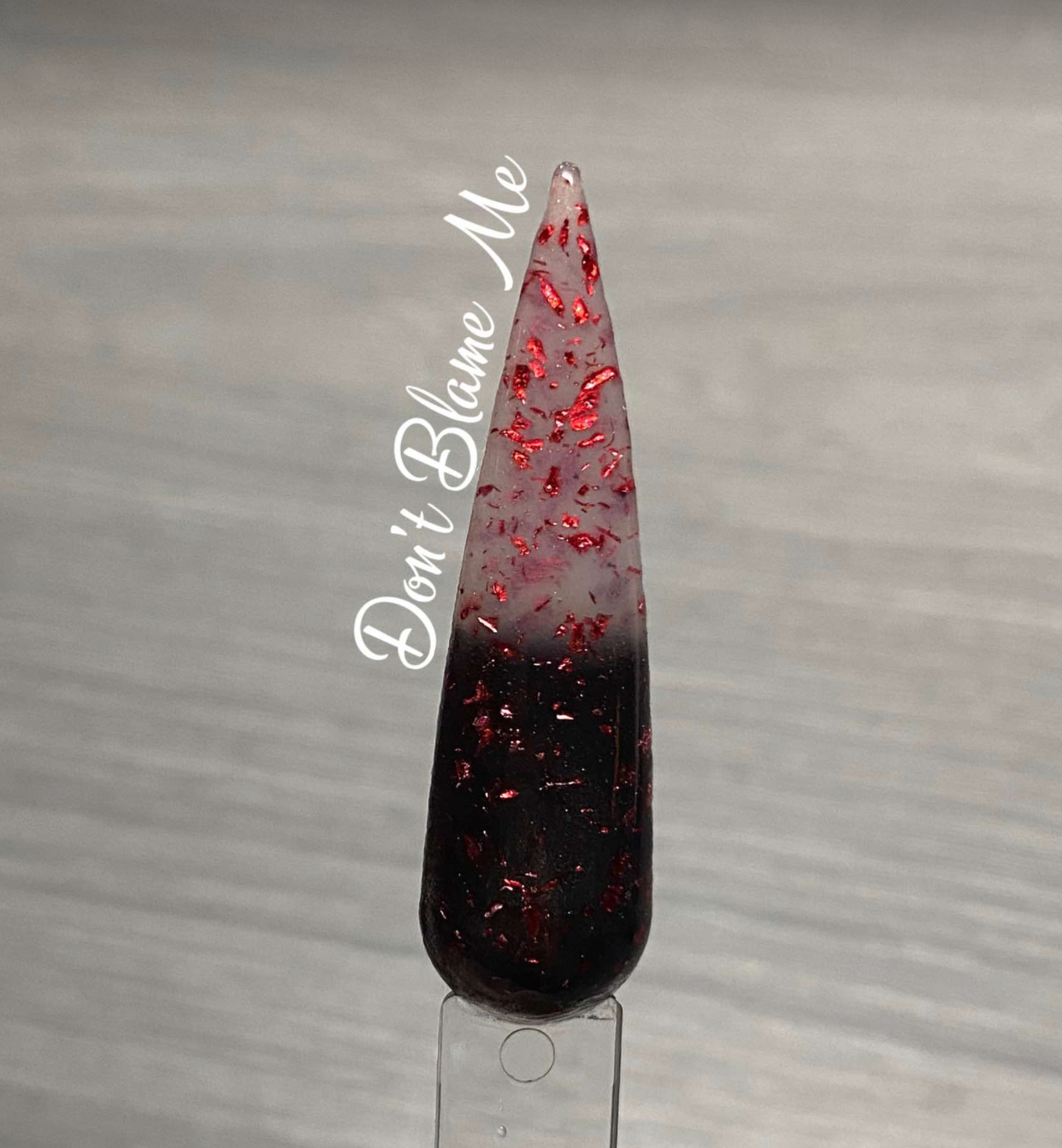 Don't Blame Me is a thermal dip powder. It shifts from black when cold to a lighter gray when warm. It has red foil throughout.