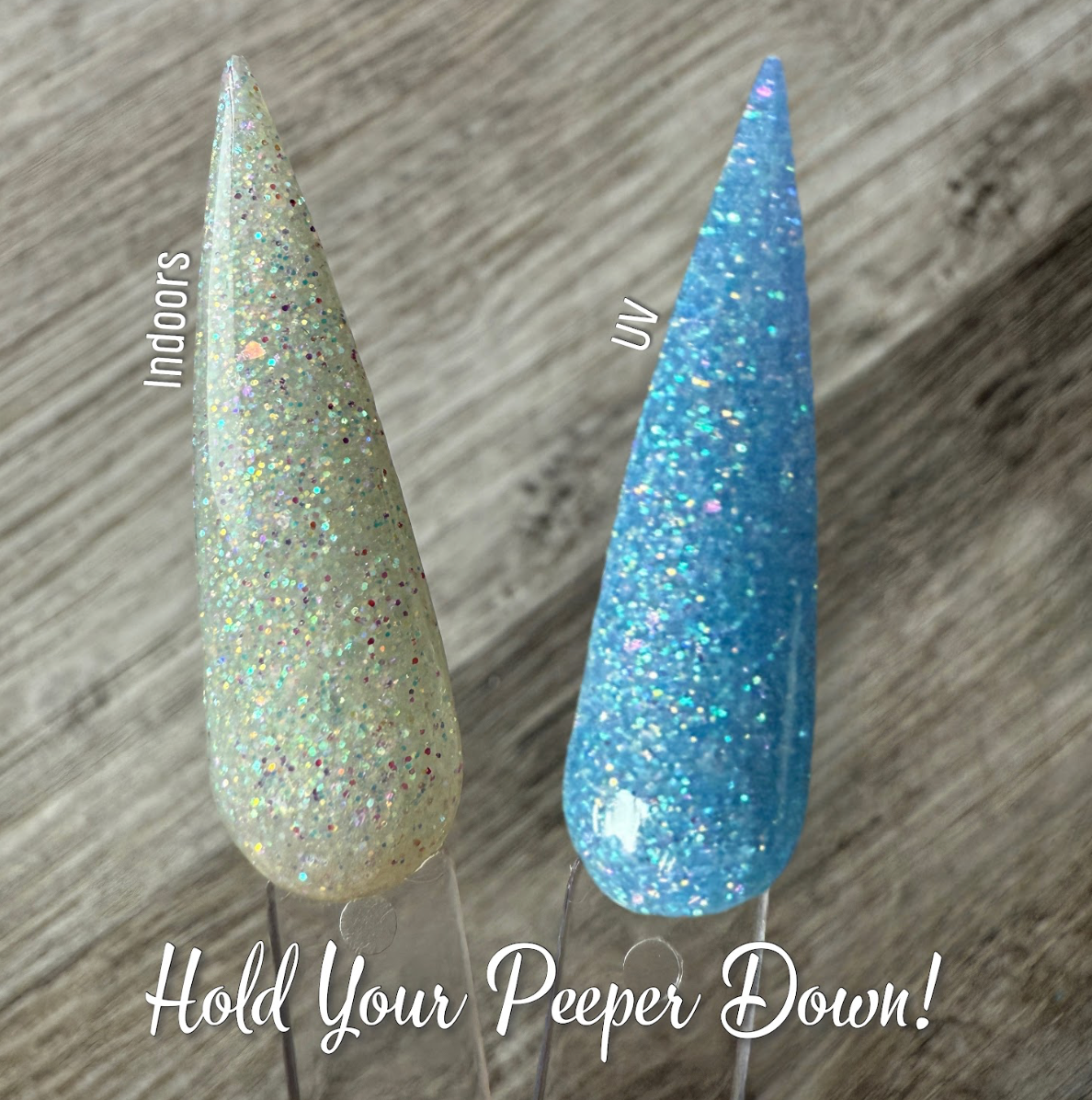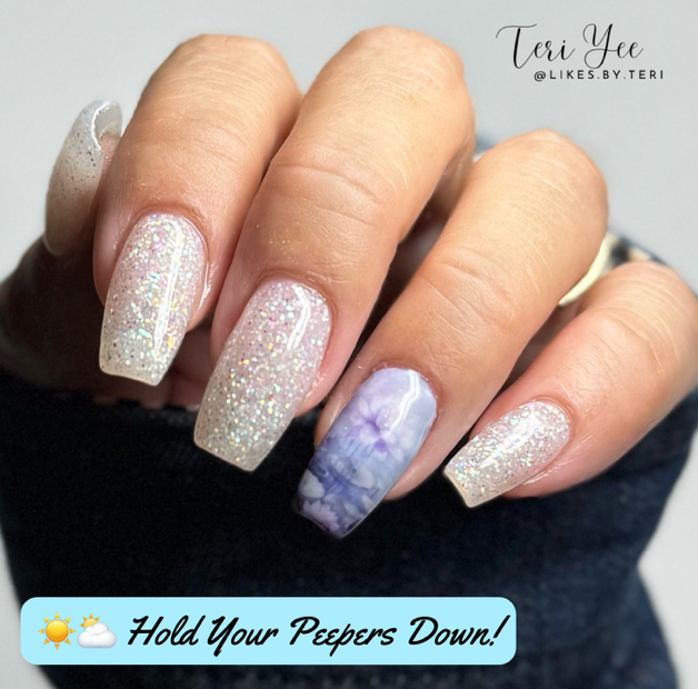 Hold Your Peeper Down! UV Dip Powder is a soft off white with flakes and glitter inside. It changes to a soft blue in the sun and a bolder blue in the UV light.