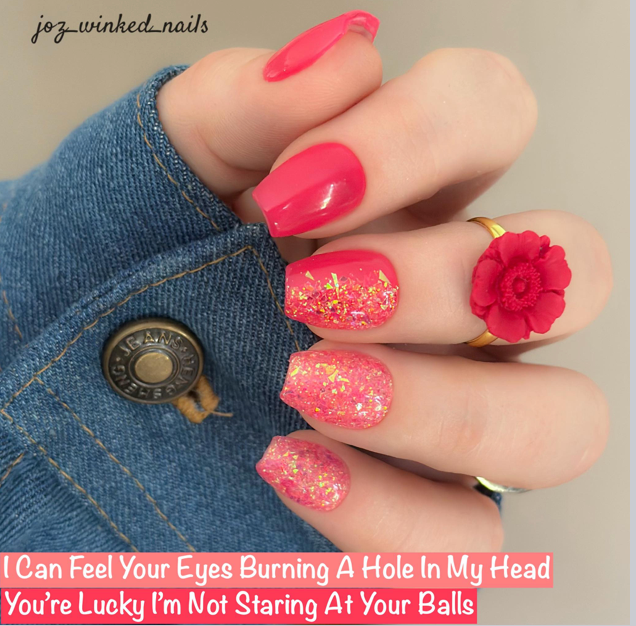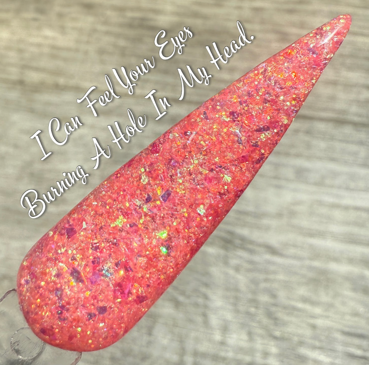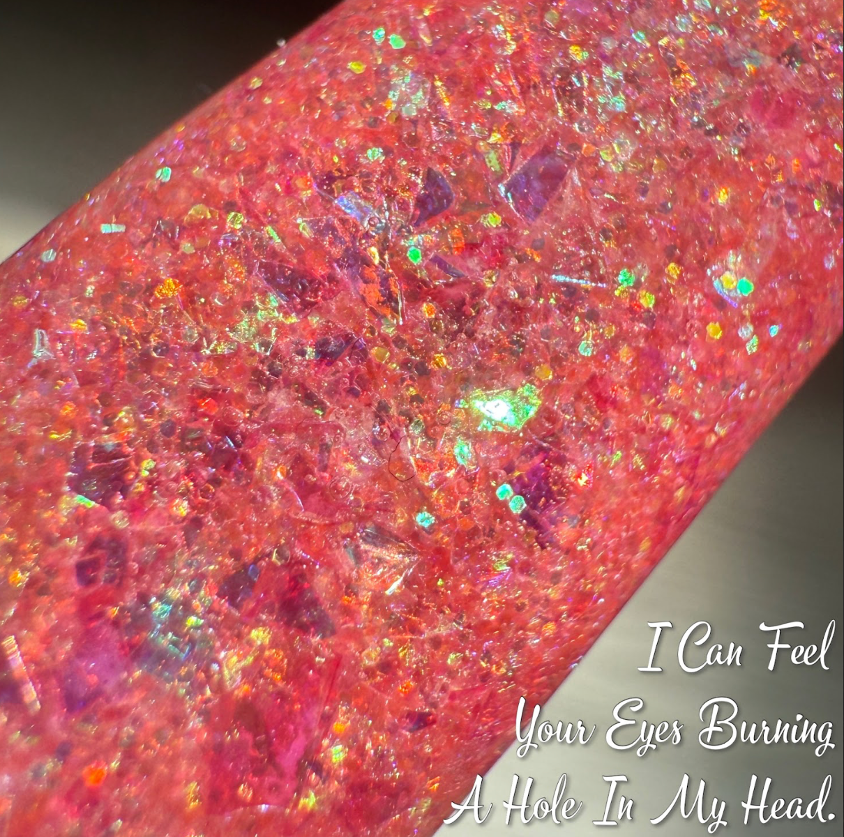 I Can Feel Your Eyes Burning A Hole In My Head is a pink and light coral glitter shard mix in a soft pinkish coral base
