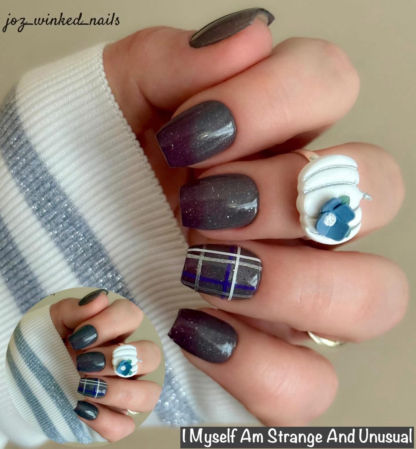 I Myself Am Strange and Unusual is a thermal Dip Powder. It is a shimmery deep purple mauve when cold and shifts to a shimmery gray when hot.
