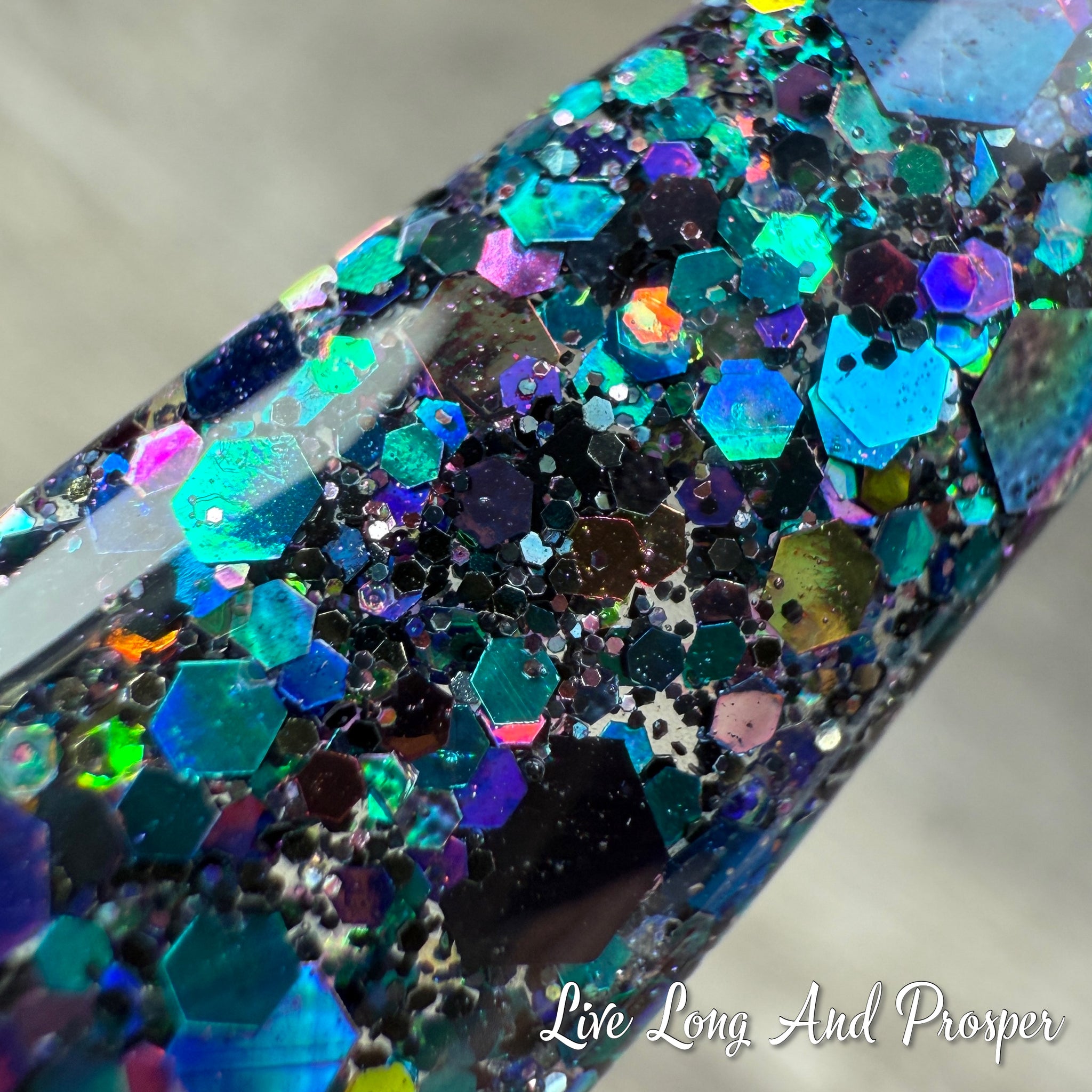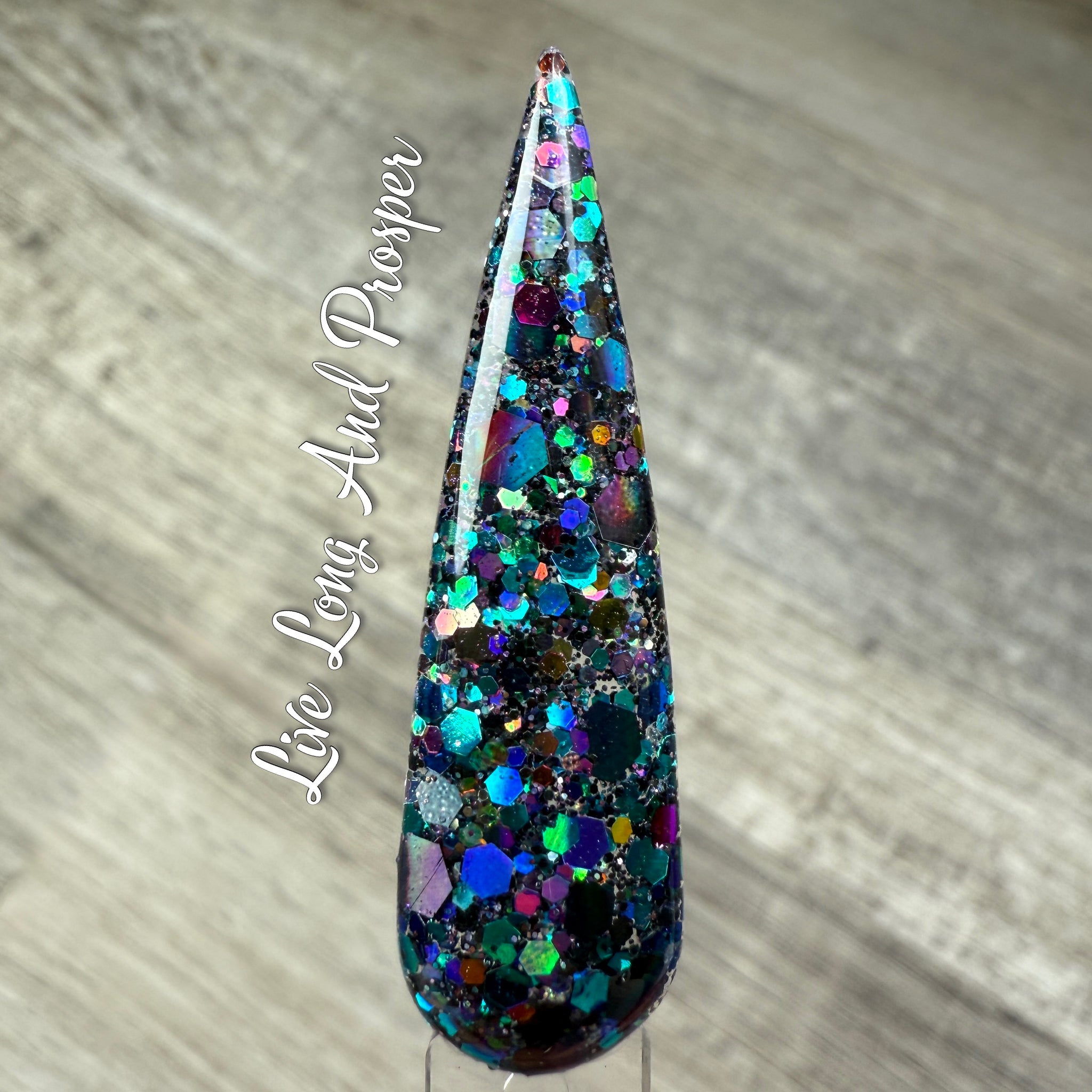 Live Long And Prosper has a dark base with color shifting chunky glitter throughout.