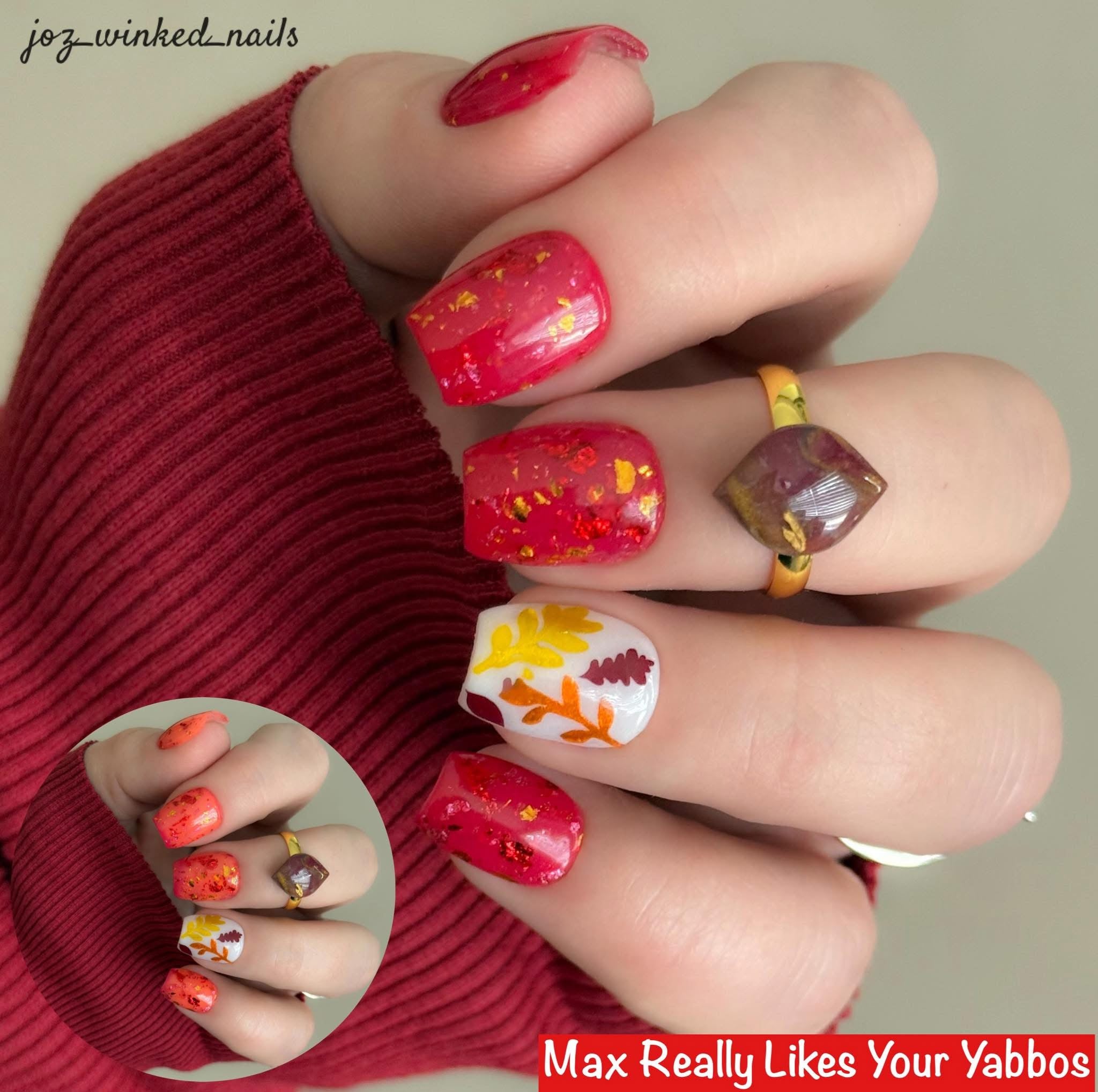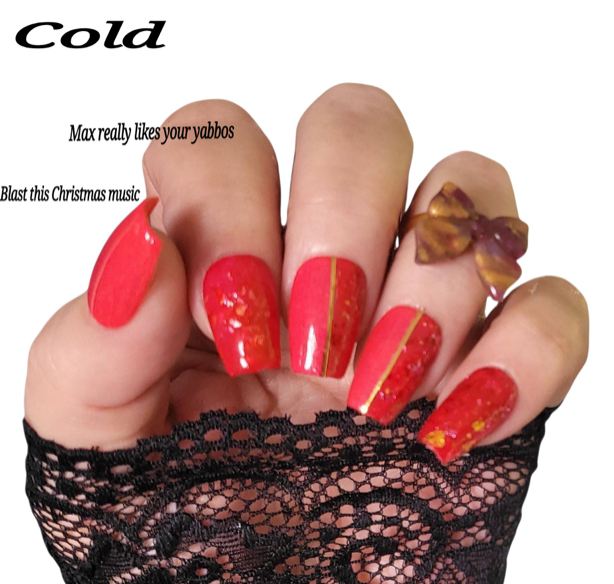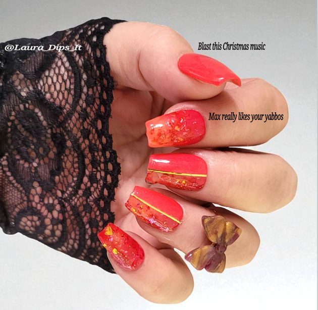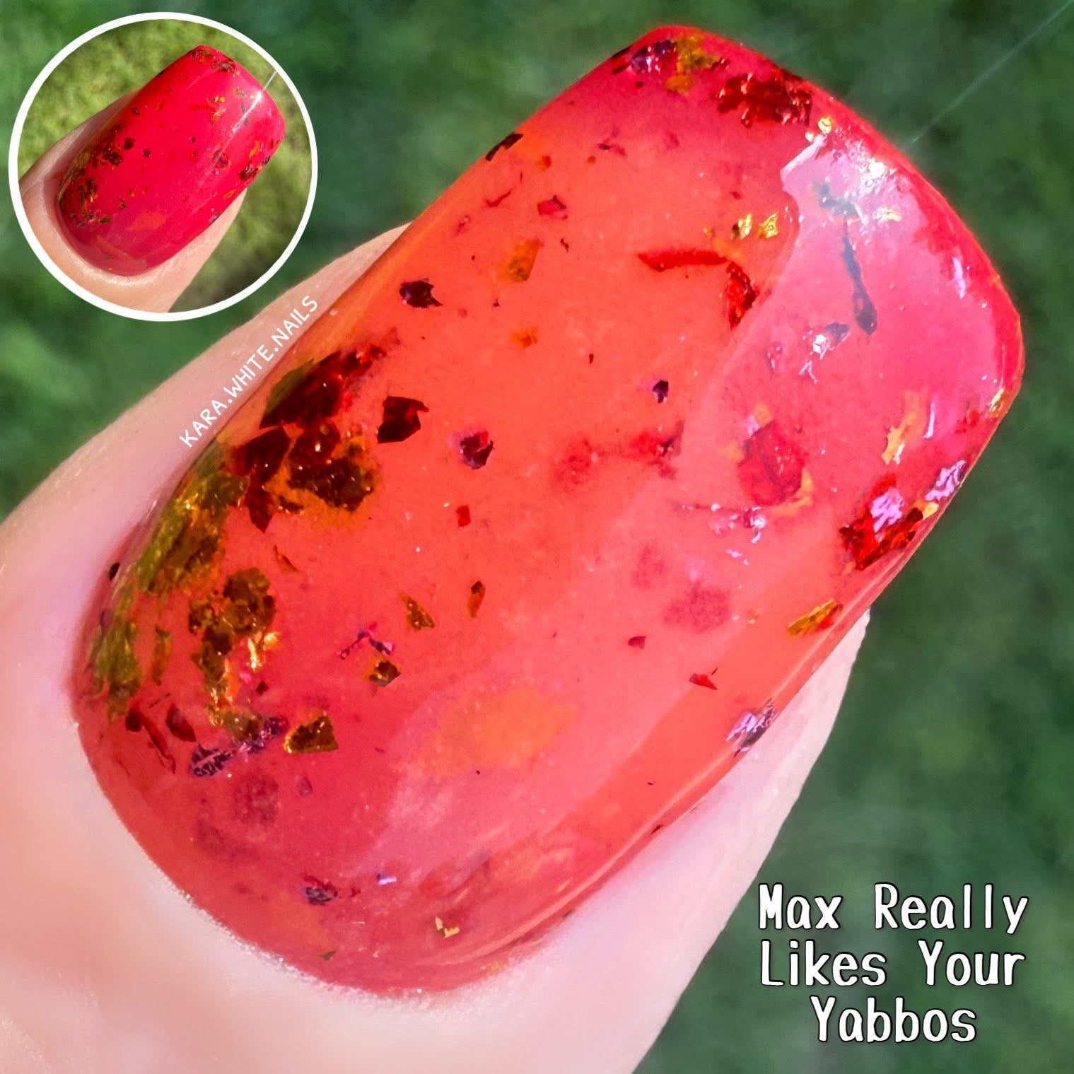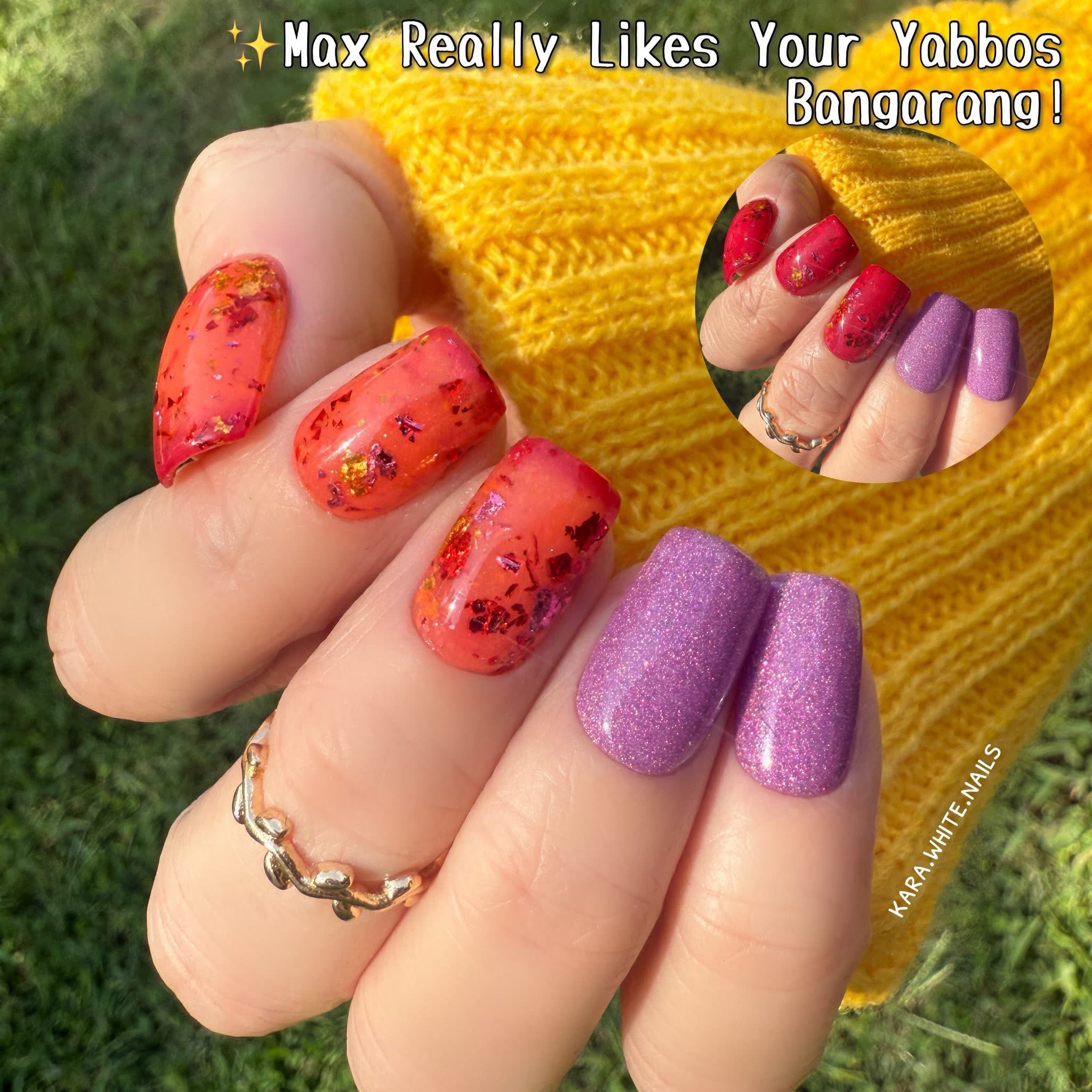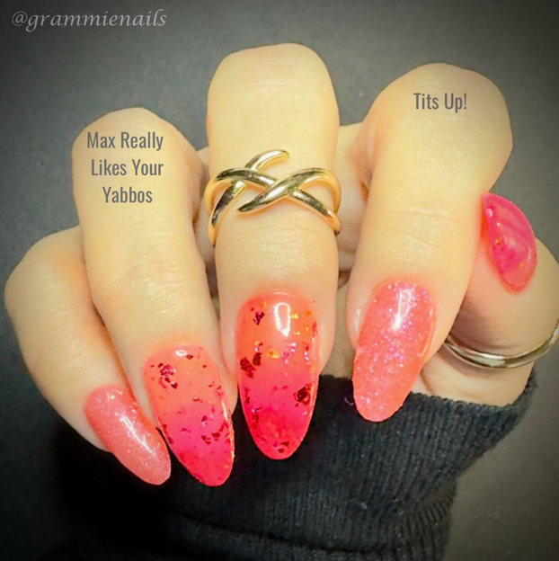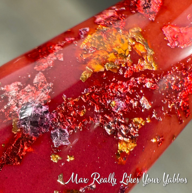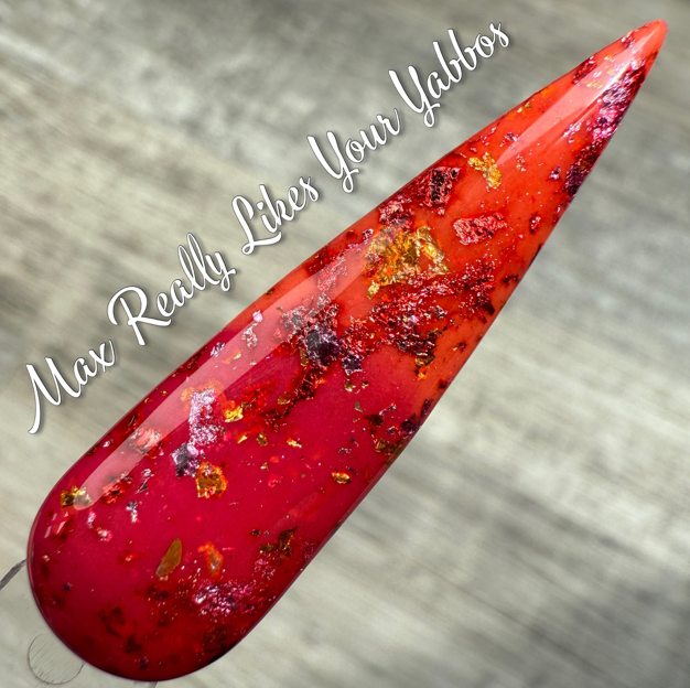 Max Really Likes Your Yabbos is a triple thermal dip that is red when cold a pink when warm and an orange when hot. There is pink, red, and gold foil throughout