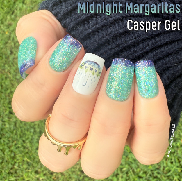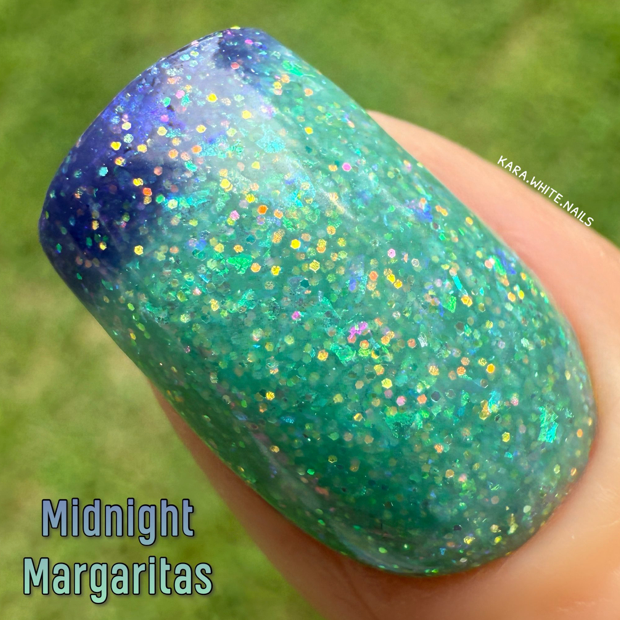 Midnight Margaritas is a navy to lime green thermal with fine glitter and flakes throughout.