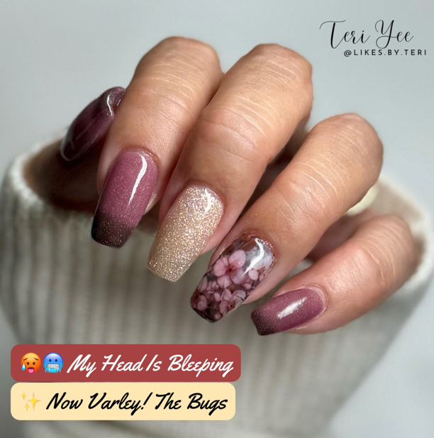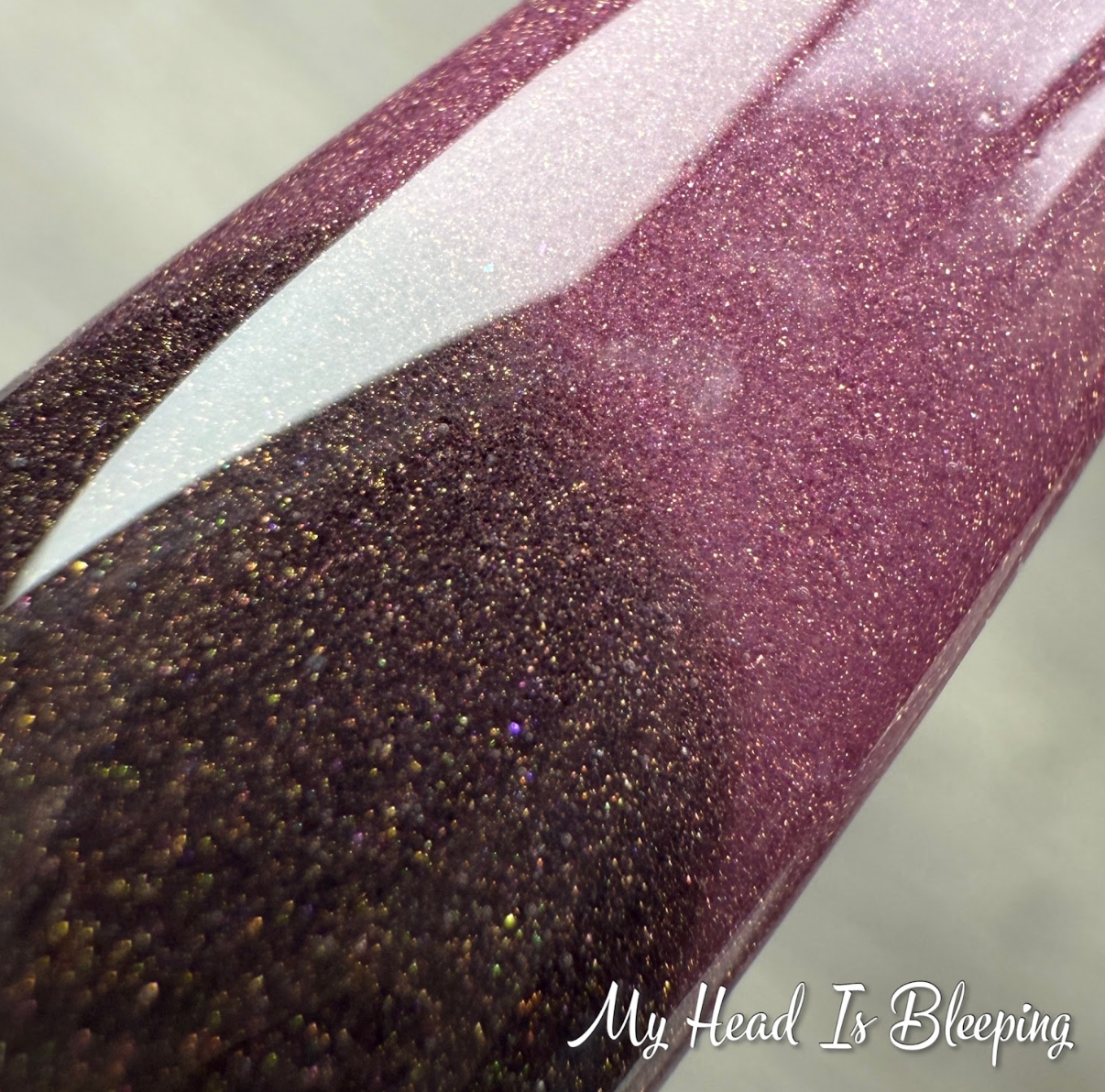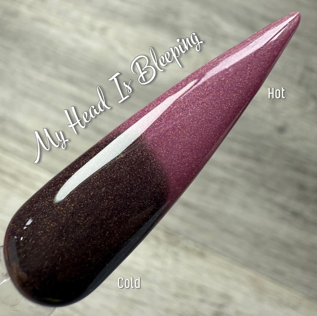My Head Is Bleeping Dip Powder is a shimmery brown when cold and shifts to a deep rose berry when hot.