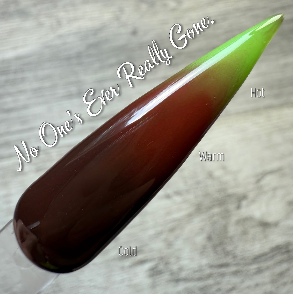 No One’s Ever Really Gone is a brown thermal when cold that shifts to an orangish brown when warm and to lime green when hot.