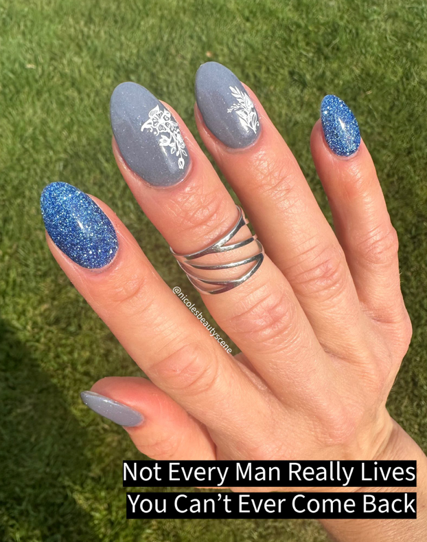 Not Every Man Really Lives is a blue with gray undertones and blue and green shimmer throughout