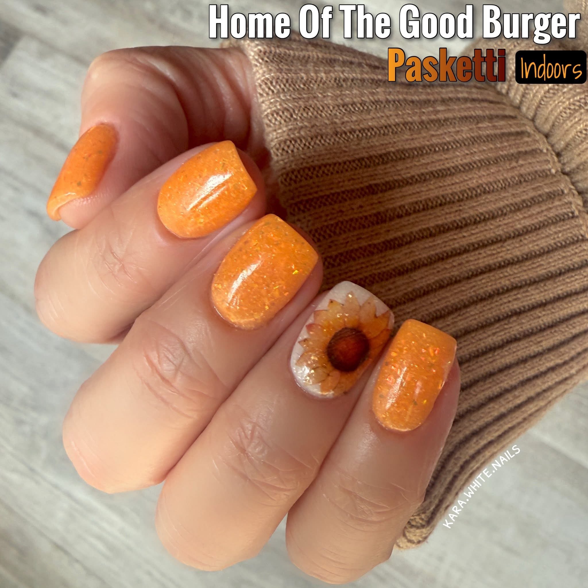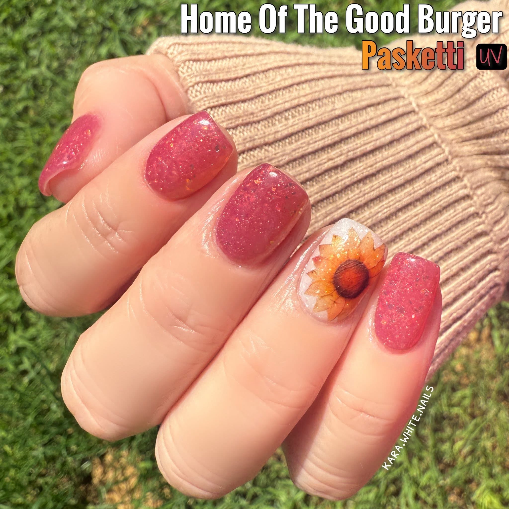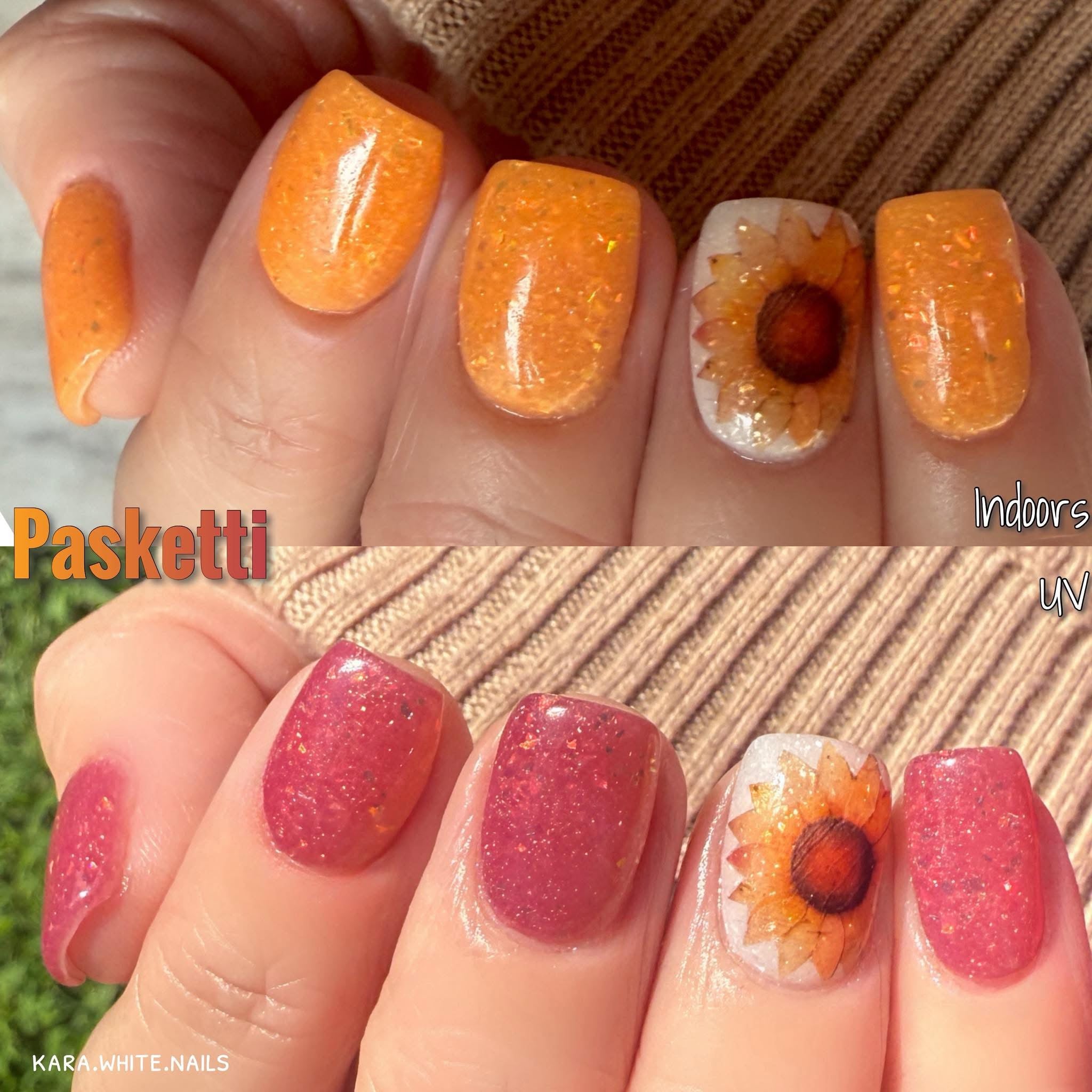 Pasketti UV Dip Powder is a warm yellow with flakes inside. It is a coral red in the sun and a deep maroon in a UV light.