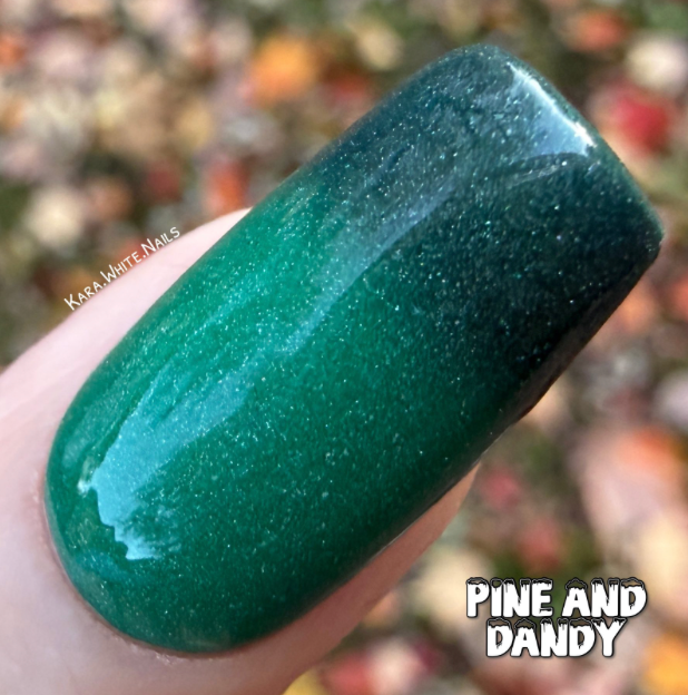 Pine And Dandy is a thermal dip powder with shimmer. It is a deeper green when cold and shifts to a lighter green when hot.