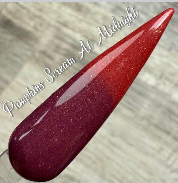 Pumpkins Scream At Midnight is a thermal dip powder. It is a shimmery maroonish purple when cold and shifts to a reddish orange when hot.