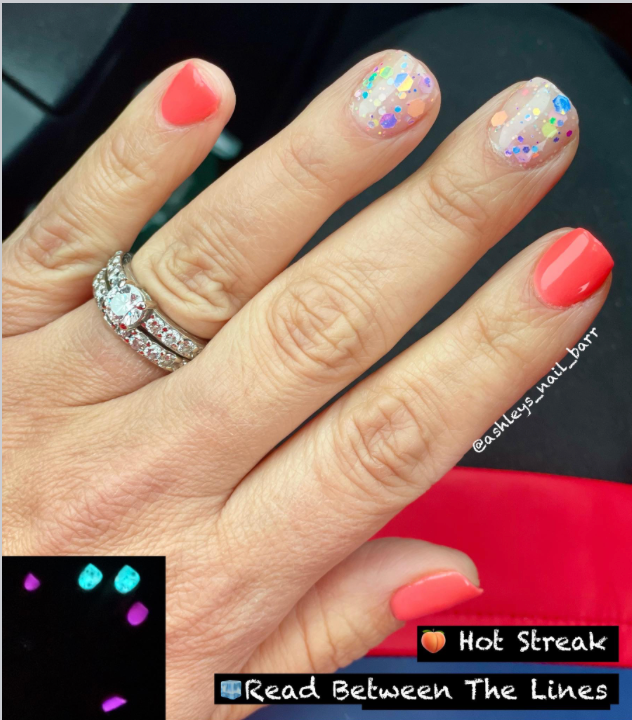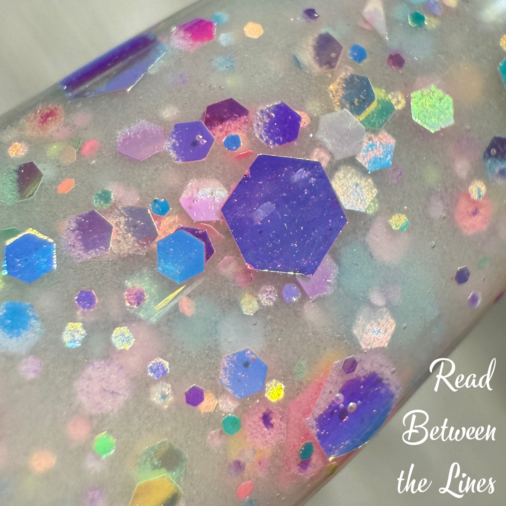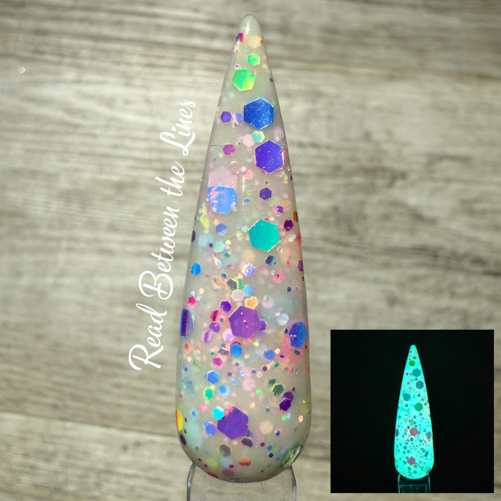 Read Between The Lines has a milky white base that glows in the dark with bright chunky glitter throughout.