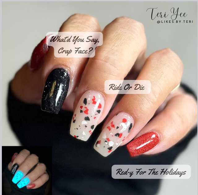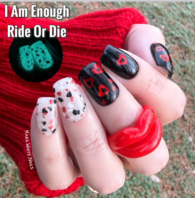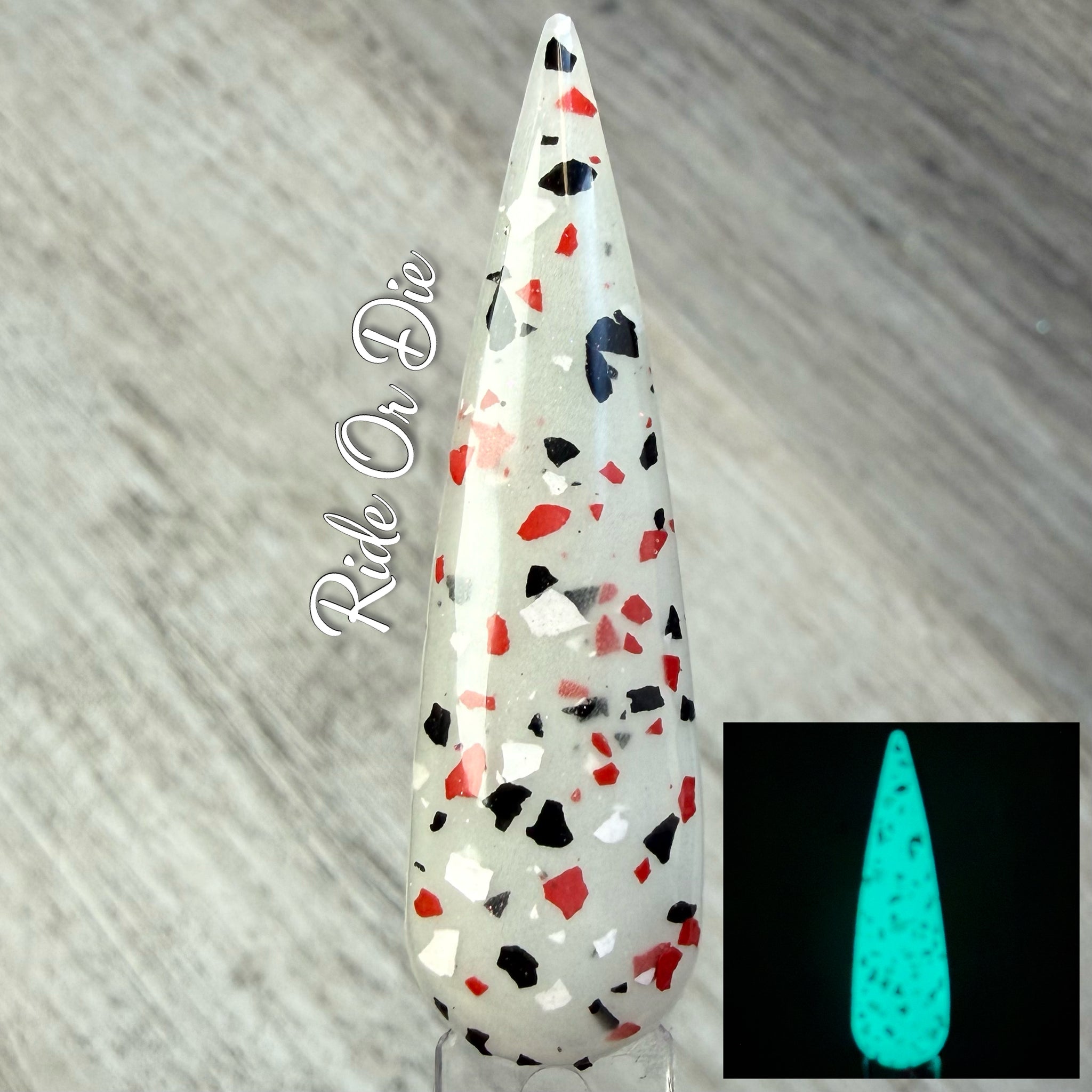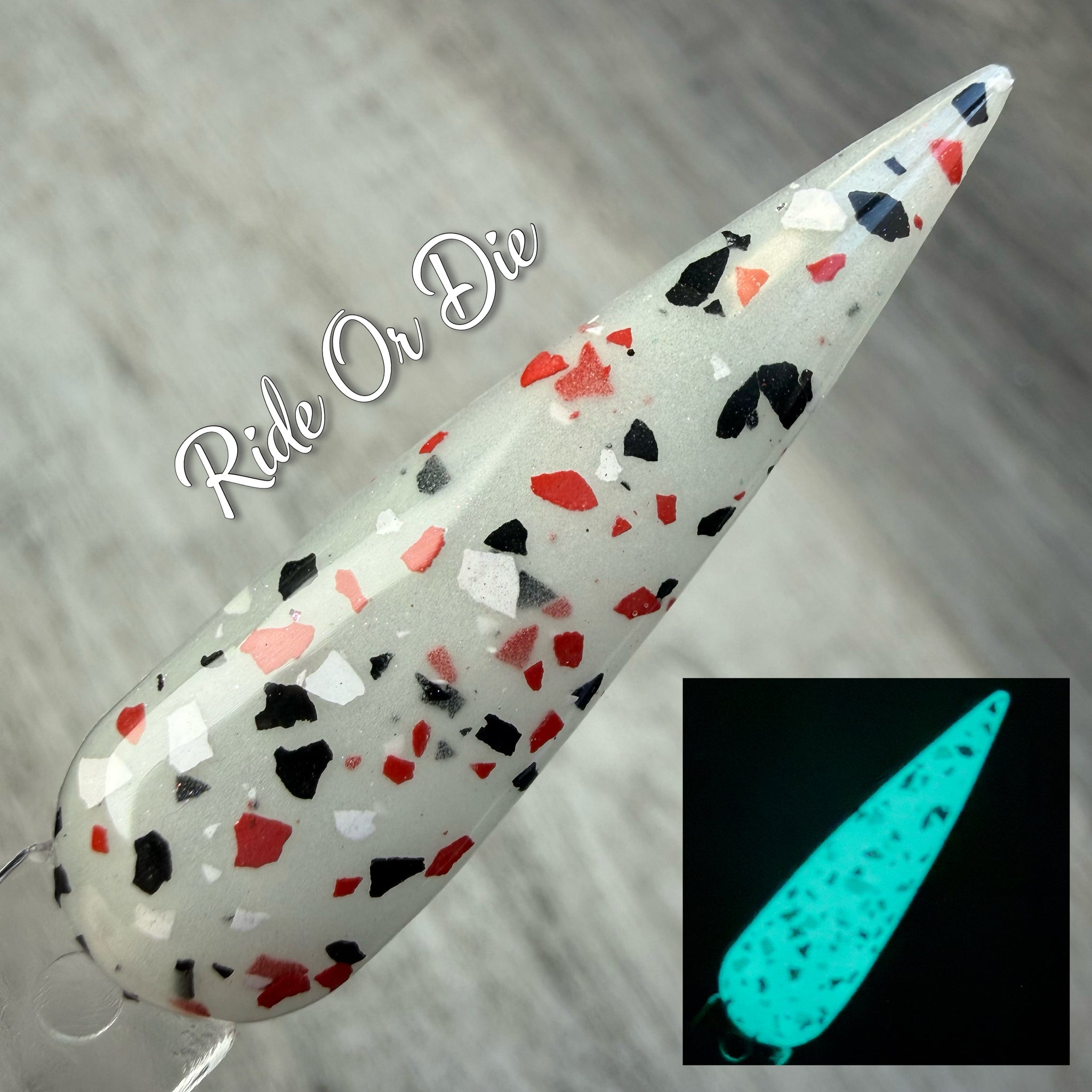 Ride Or Die has a milky glow base with red, black, and white matte glitter