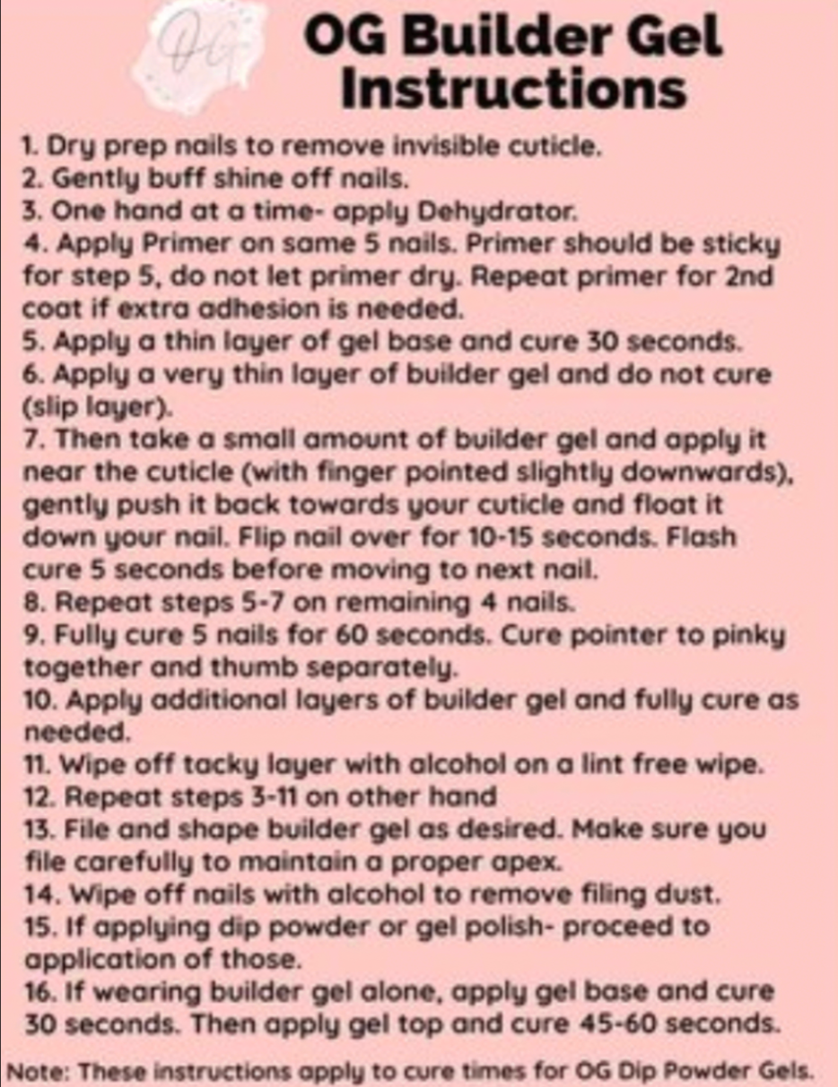 1. Prep nail. Remove invisible cuticles and shine from nail 2. Apply gel base cure in lamp for 60s 3. Apply Builder gel and cure for 60s Tip: hold finger upside down before curing for the perfect apex 4. Wipe sticky layer buff and file 5. Apply gel top coat for shiny finish.