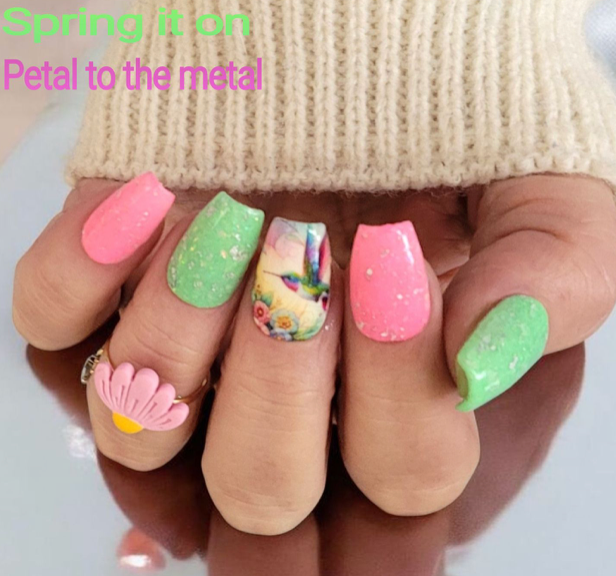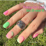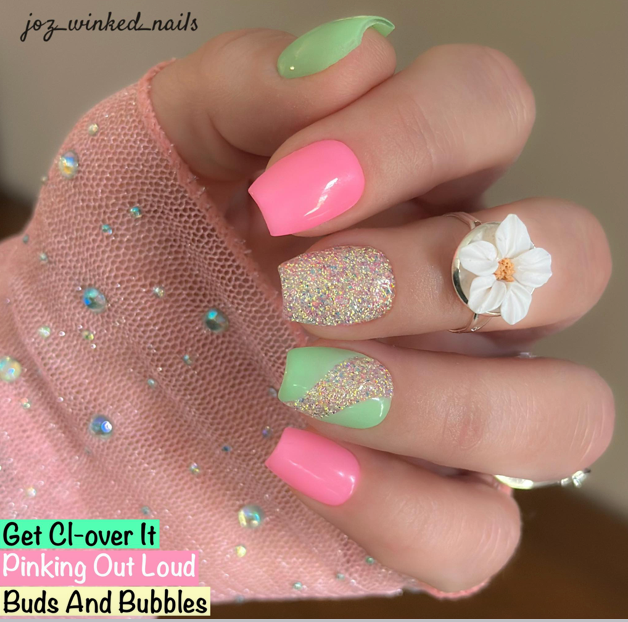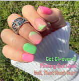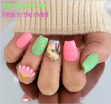 Chunky glitters/foils can be difficult to work with. Be sure to press the flakes into place and to remove any ones that poke up. Pressing down the glitter/foil with a sandwich bag can sometimes make the process easier. It is recommended to top glitters and foils with one to two layers of clear dip powder for an even finish.