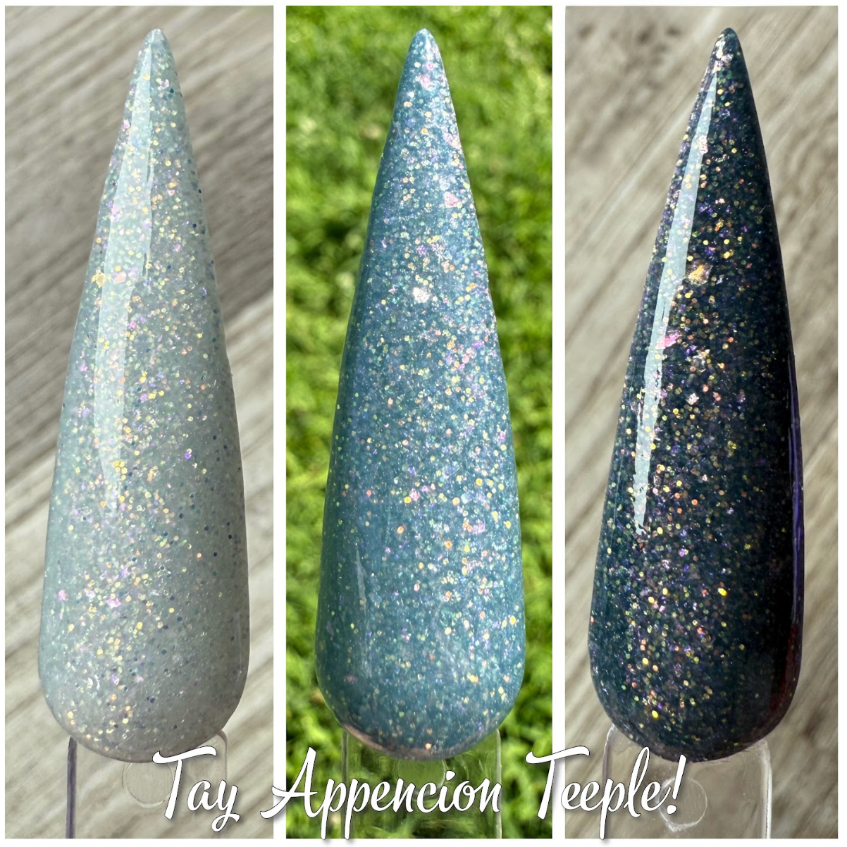 Tay Appencion Teeple! UV Dip Powder is a soft gray with flakes and glitter inside. It changes to a medium gray in the sun and a darker gray in the UV lamp.