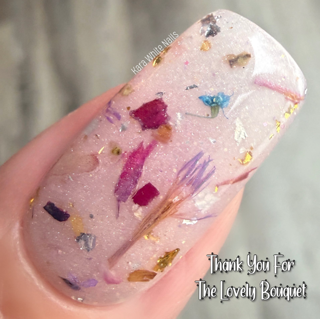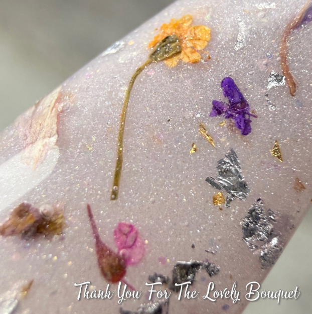 Thank You For The Lovely Bouquet is a shimmery sheer neutral base with pops of gold and silver foil throughout and dried floral pieces.