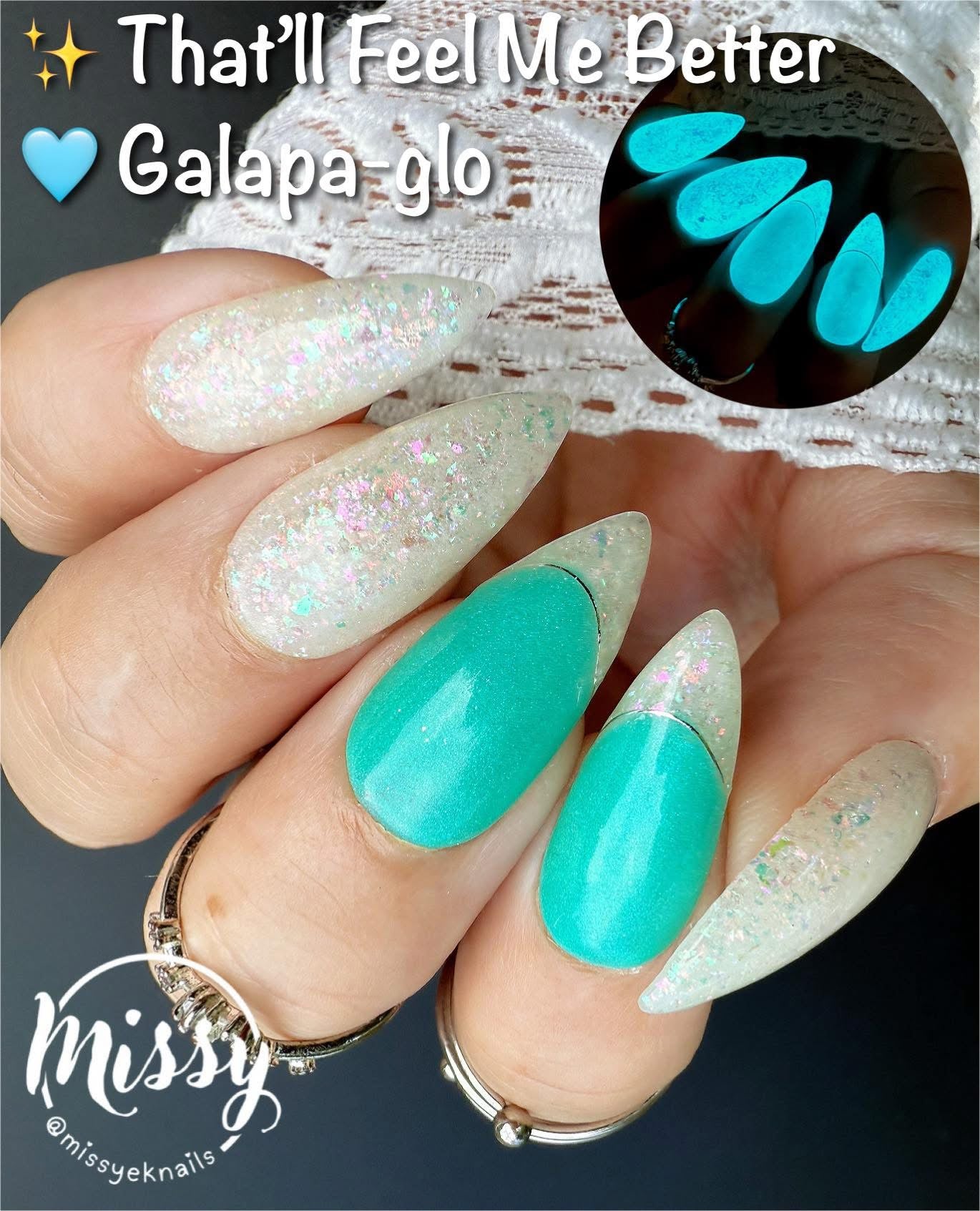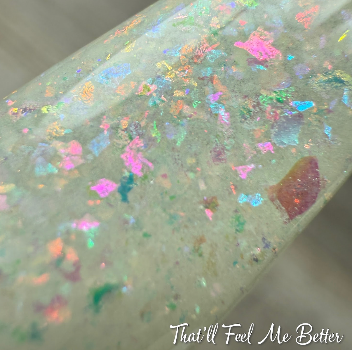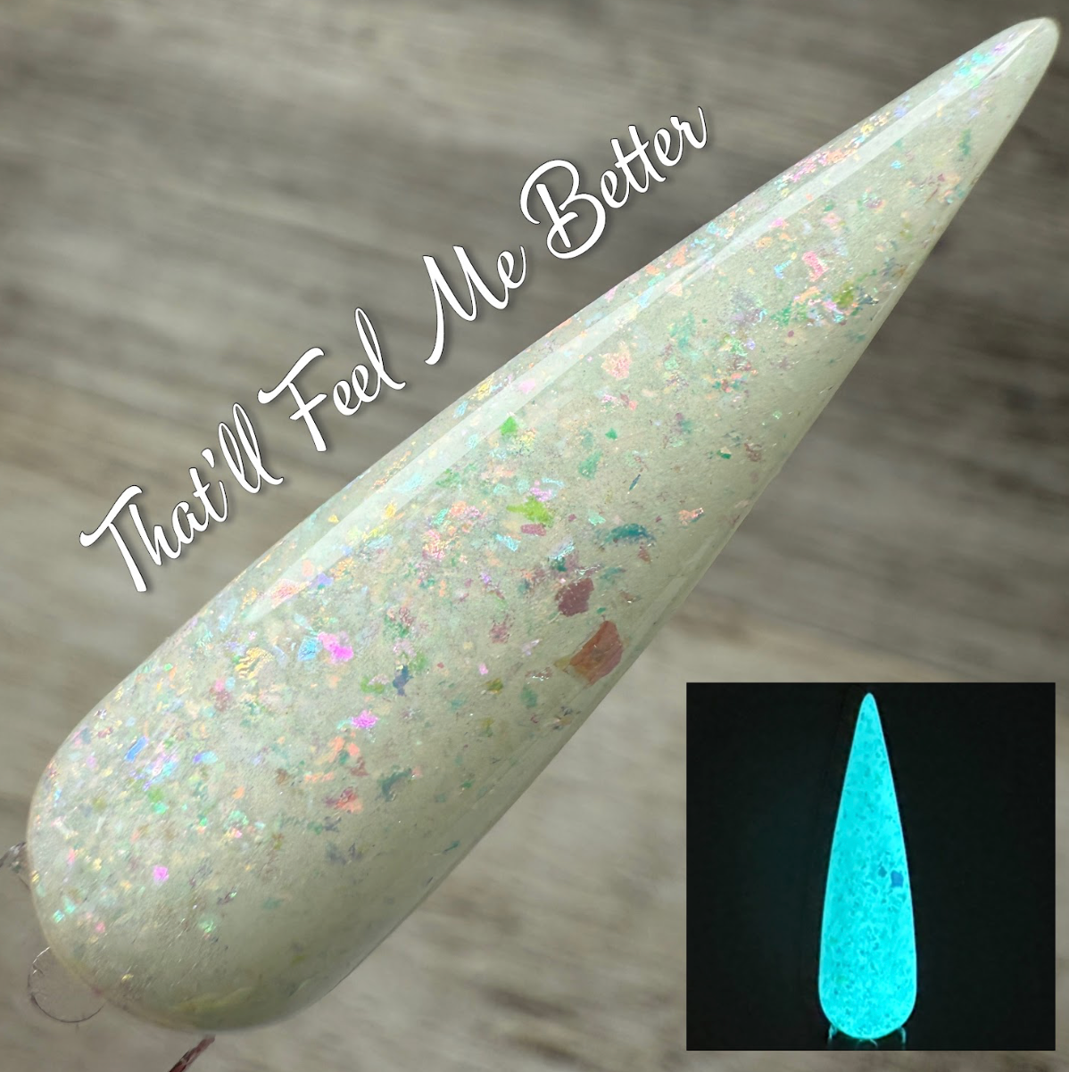 That'll Feel Me Better is a soft white with various shades of flakes throughout. It glows in the dark.