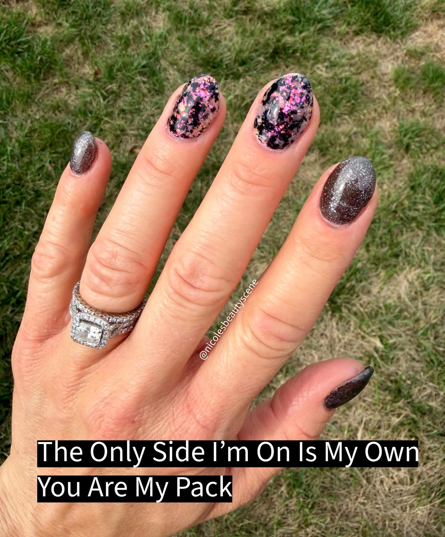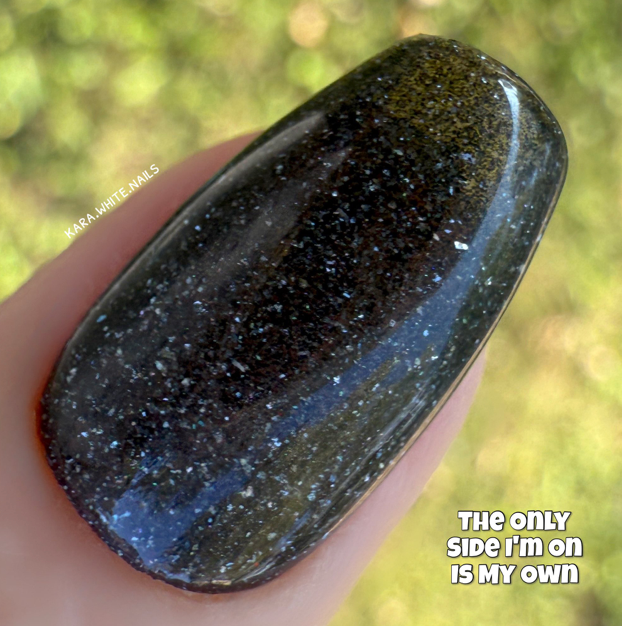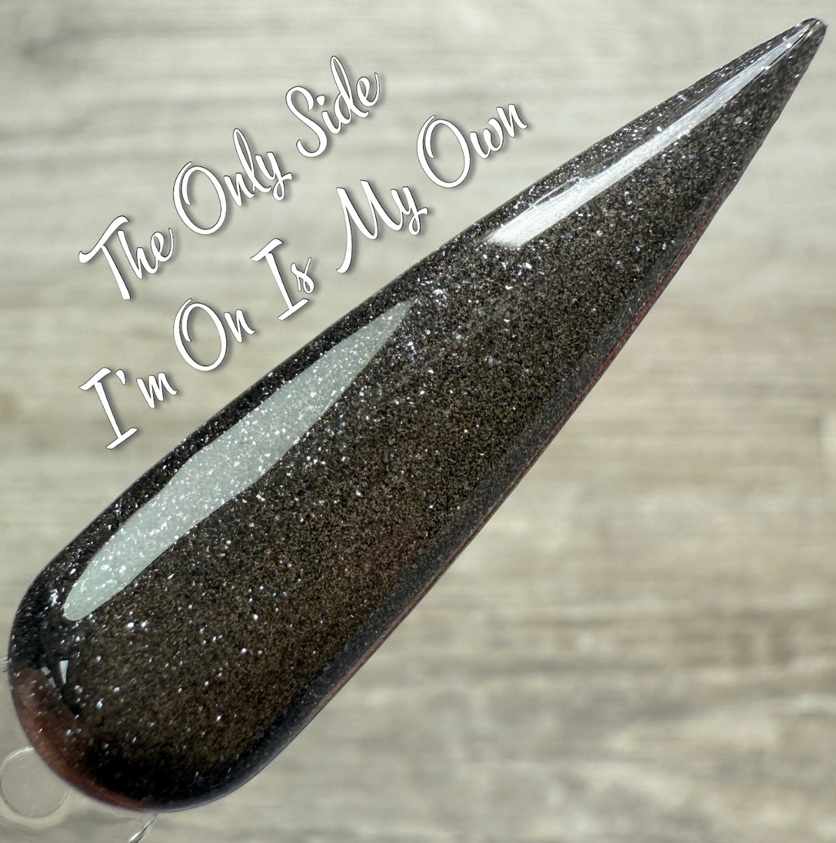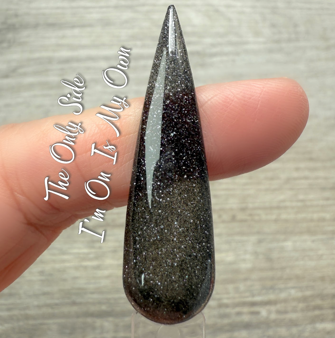 The Only Side I'm On Is My Own is a sheer super shimmery black solid. Would take 3+ dips to be close to opaque