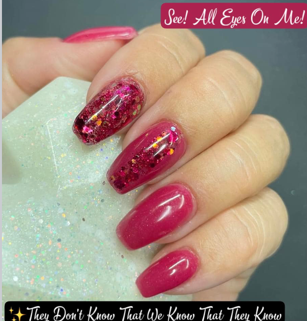 They Don't Know That We Know That They Know is a mix of chunky, mini chunk, and fine glitter that shifts pink and maroon.
