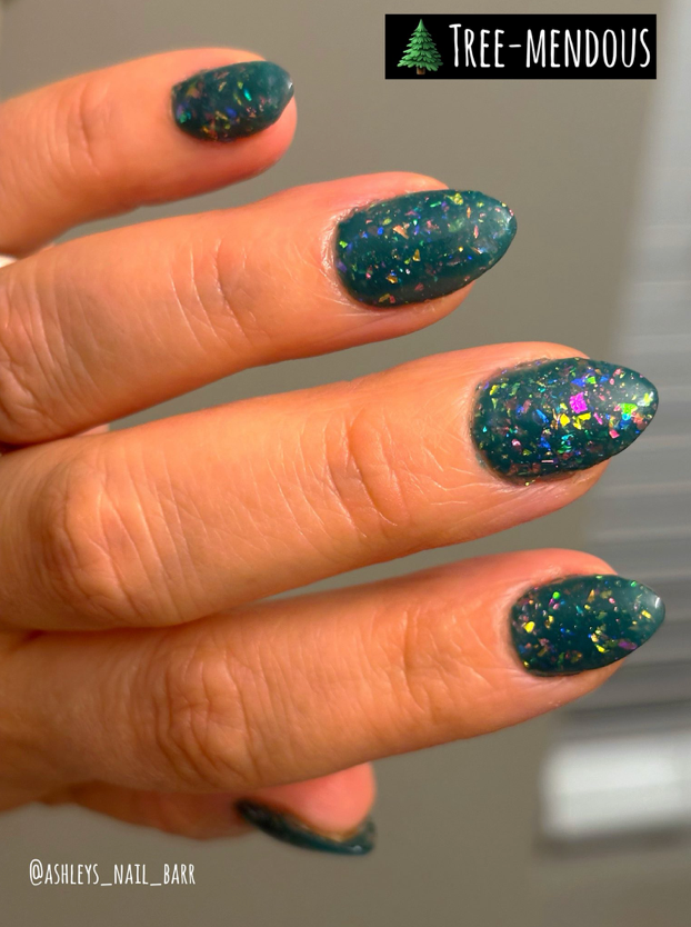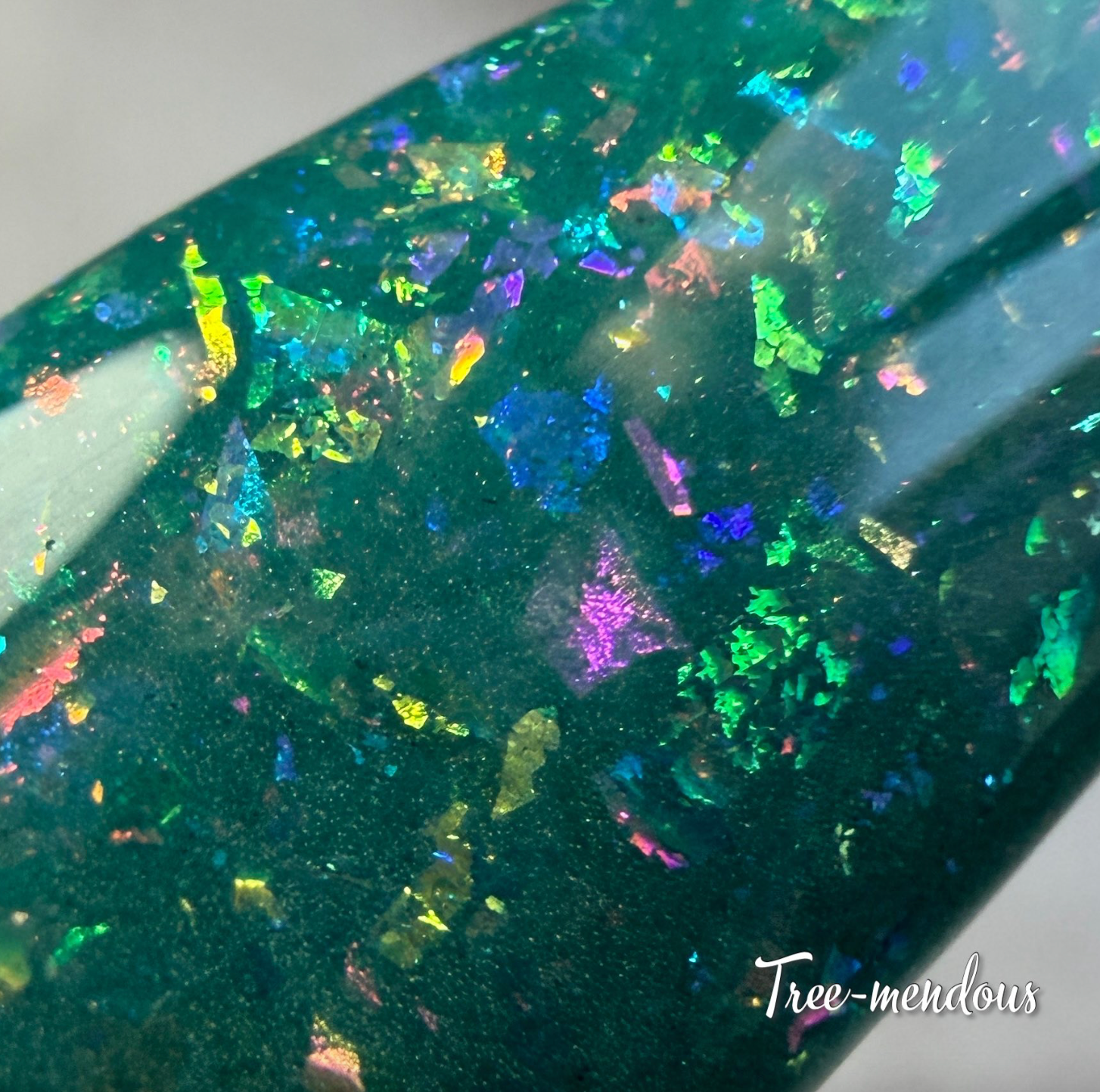 Tree-mendous has a teal green flat base with iridescent color shifting flakes throughout.