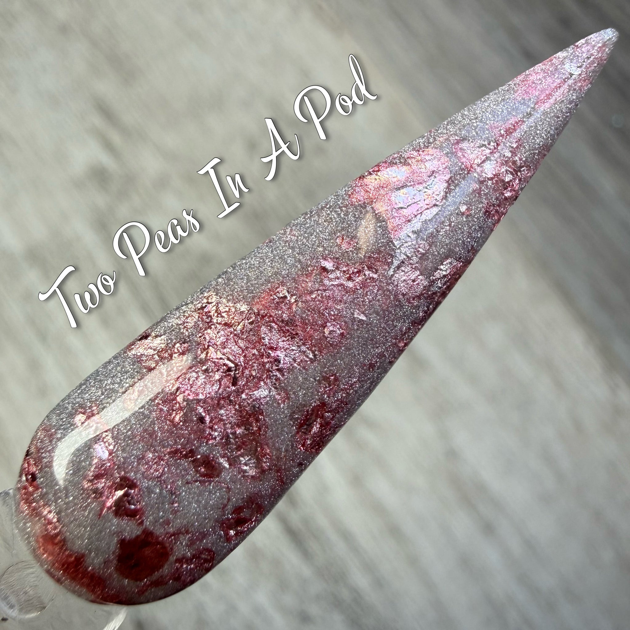 Chunky glitters/foils can be difficult to work with. Be sure to press the flakes into place and to remove any ones that poke up. Pressing down the glitter/foil with a sandwich bag can sometimes make the process easier. It is recommended to top glitters and foils with one to two layers of clear dip powder for an even finish.