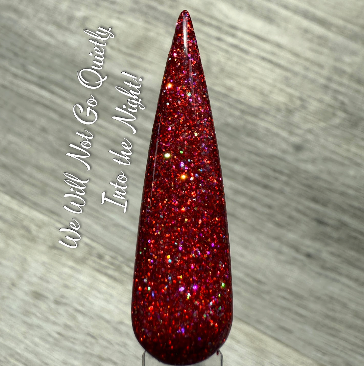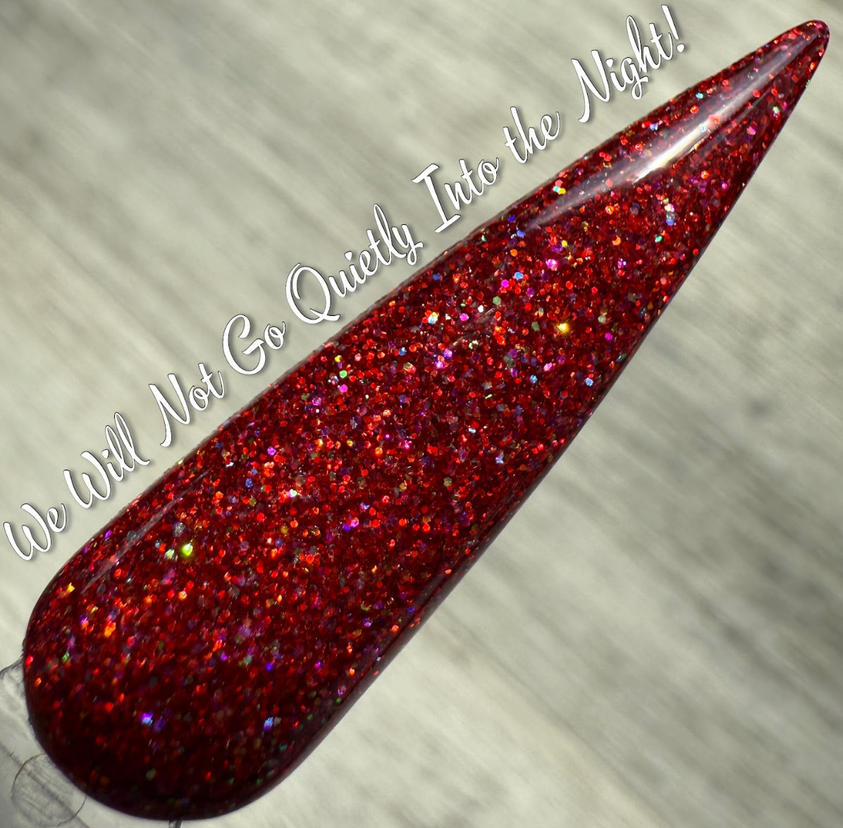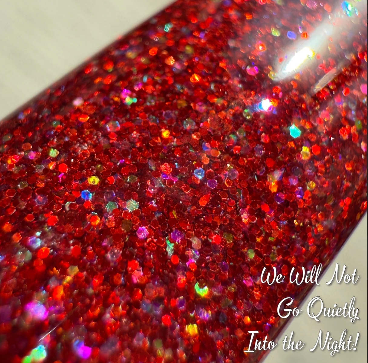 We Will Not Go Quietly Into The Night! is a red fine holographic glitter with a rainbow shift