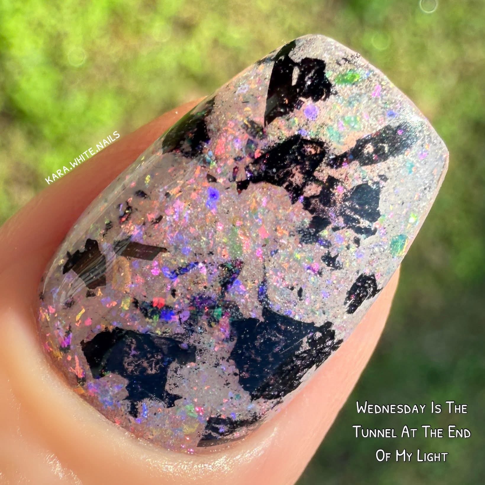 Wednesday is The Tunnel At The End Of My Light is a milky base with flakes throughout and black foil. Glows in the dark.
