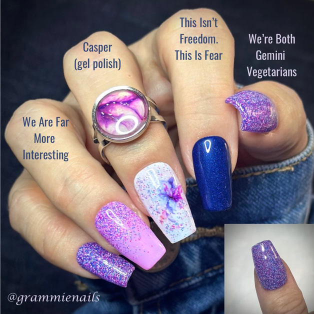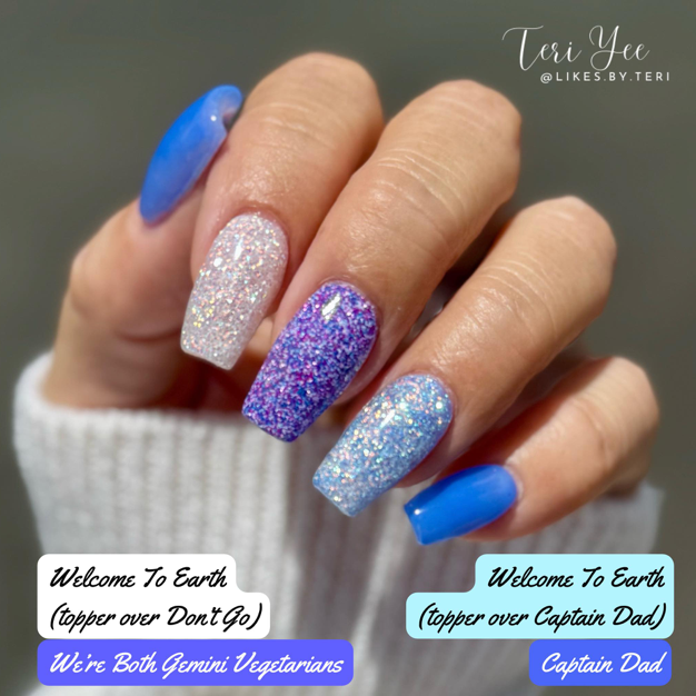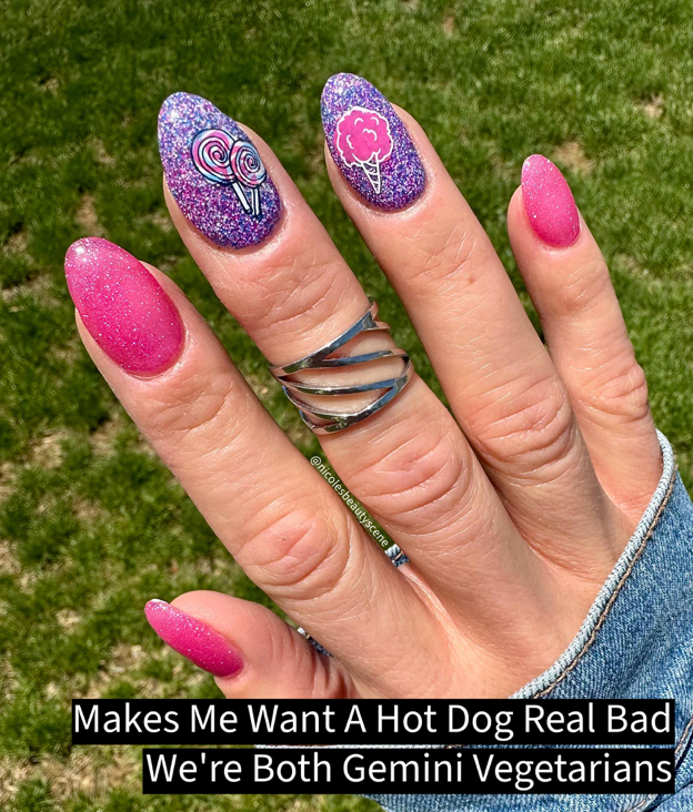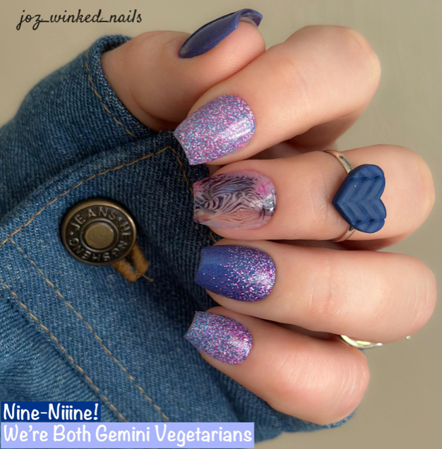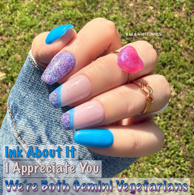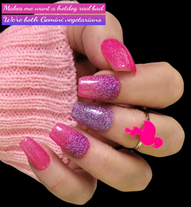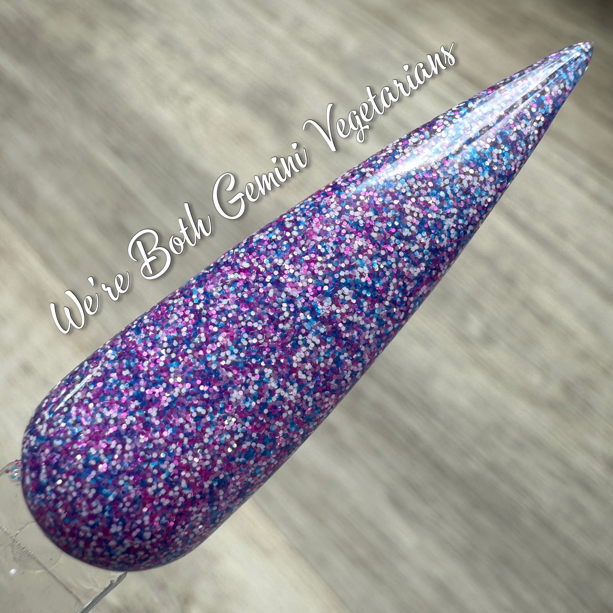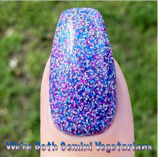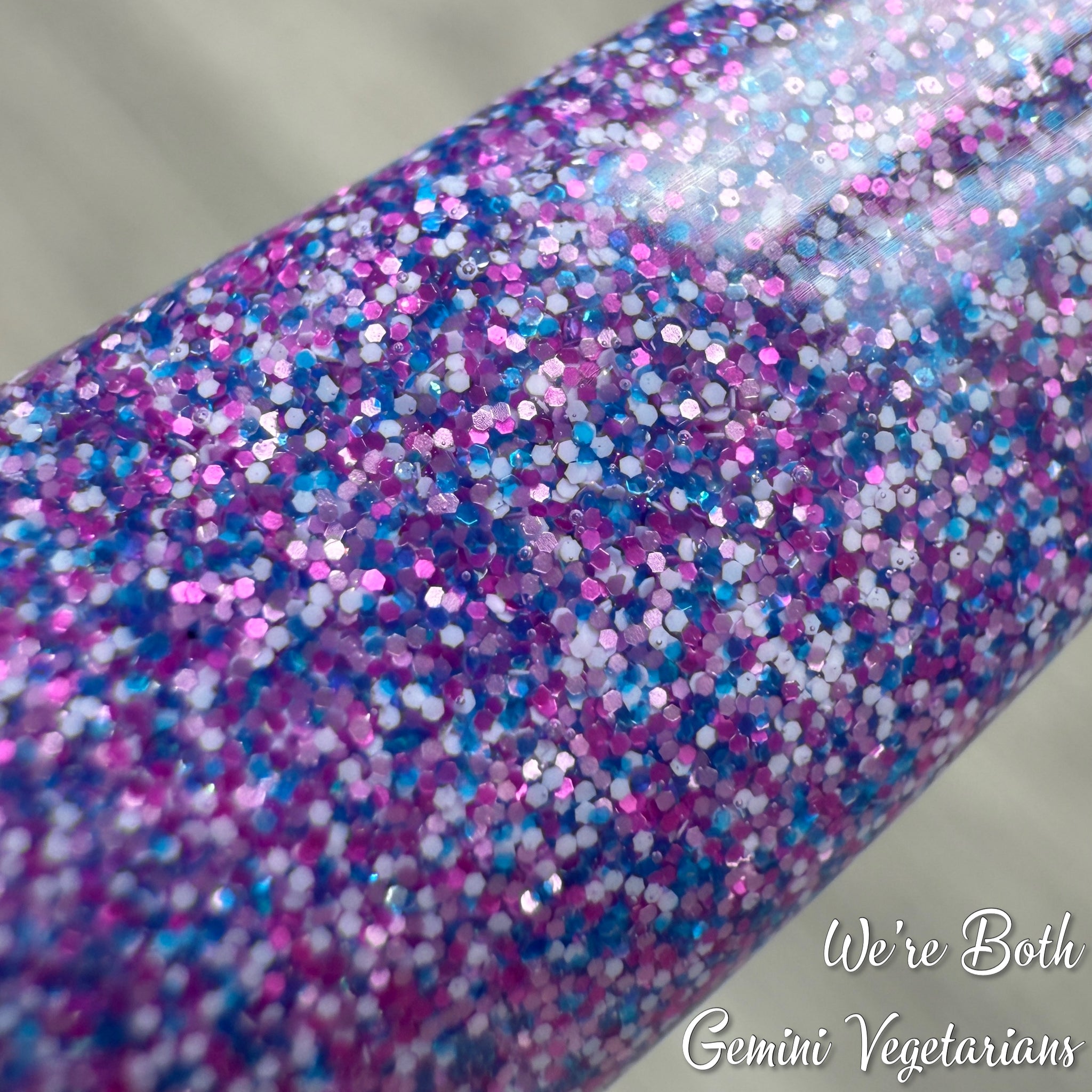 We're Both Gemini Vegetarians is a mix of white, blue, medium pink, and brighter pink matte fine glitter.