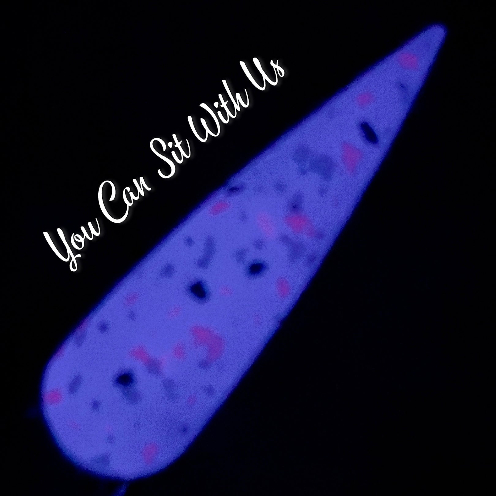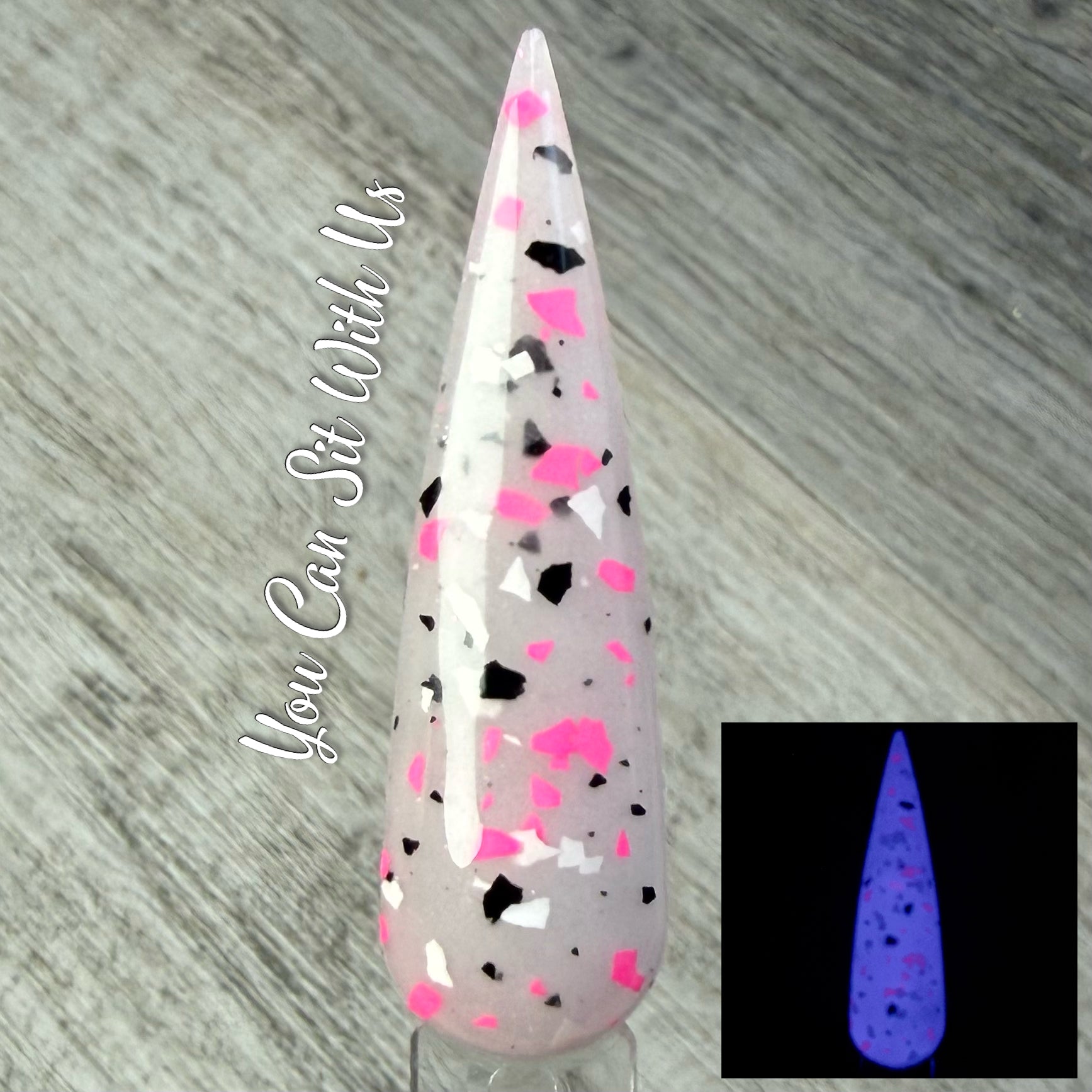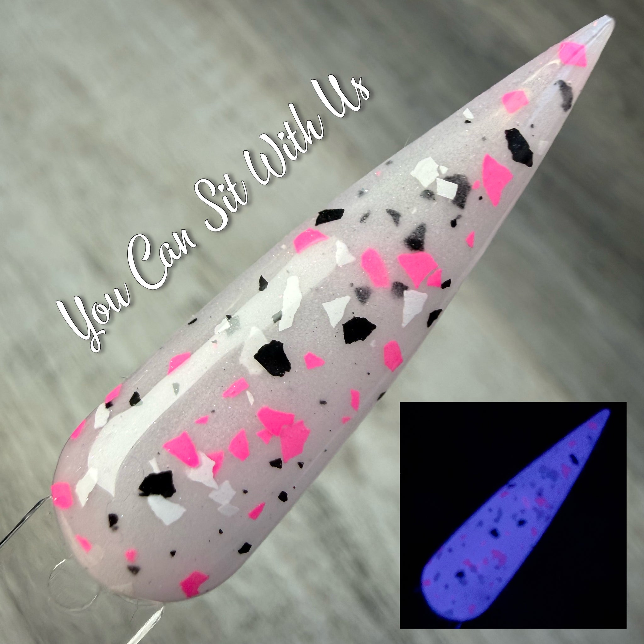 You Can Sit With Us has a milky glow base with hot pink, black, and white matte glitter