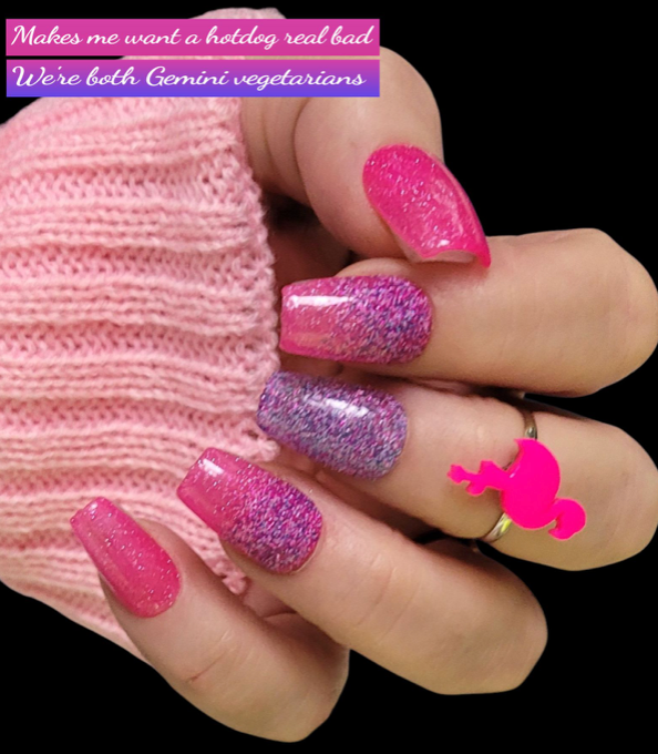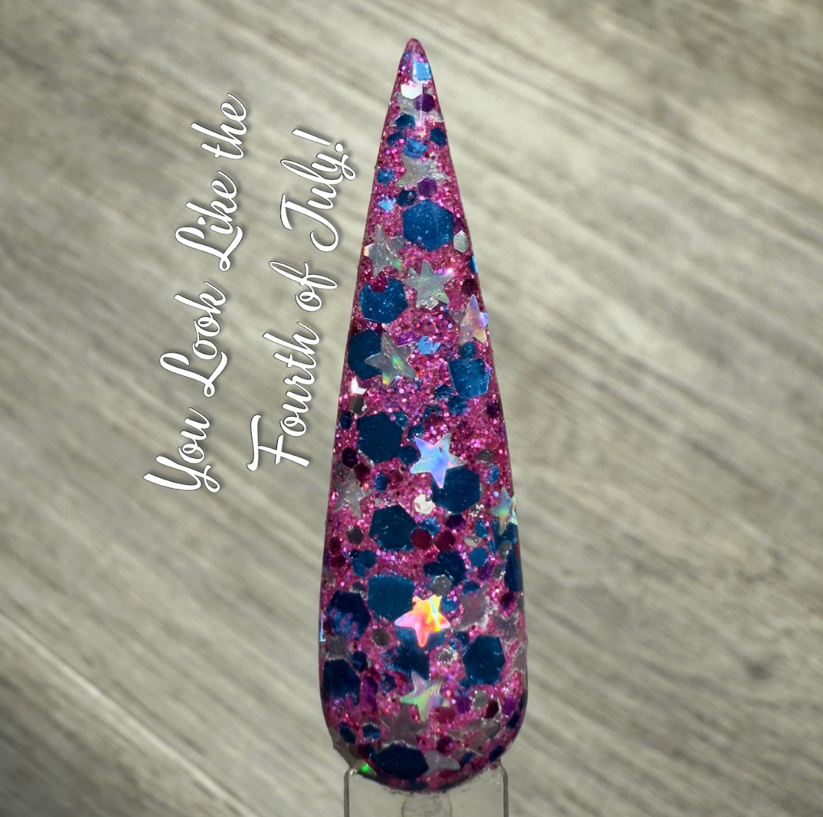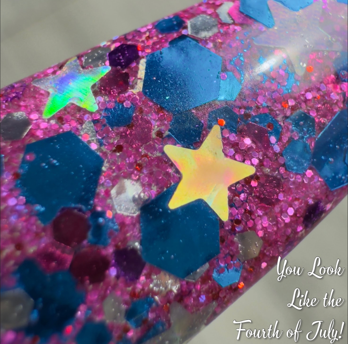 You Look Like The Fourth Of July! has a pink glitter base with blue, silver, and pink chunky glitter.