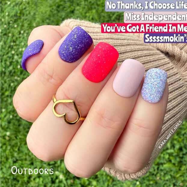 Chunky glitters/foils can be difficult to work with. Be sure to press the flakes into place and to remove any ones that poke up. Pressing down the glitter/foil with a sandwich bag can sometimes make the process easier. It is recommended to top glitters and foils with one to two layers of clear dip powder for an even finish