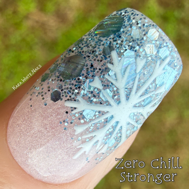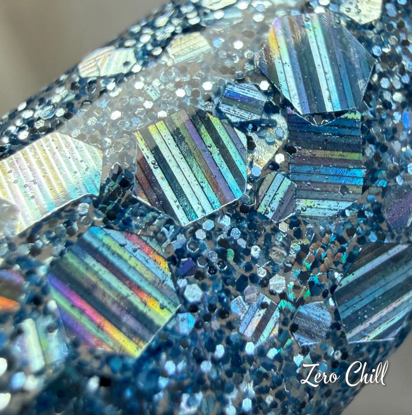 Zero Chill is a light blue fine glitter base with chunky soft blue glitter throughout